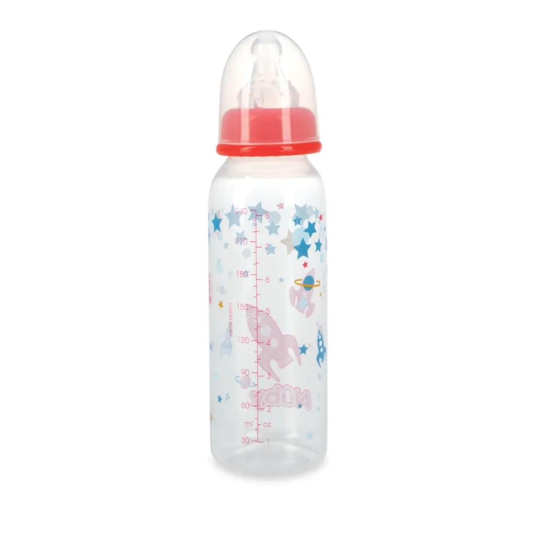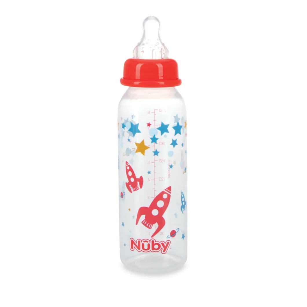 El biberón de plástico de la marca Nuby de 240 ml, con tetina de silicona de diseño ergonómico, ligero, fabricado en plástico, fácil de transportar, con una funda para protegerlo de la contaminación, además está equipado con una válvula que evita que entre aire en el estómago del niño para aliviar los cólicos