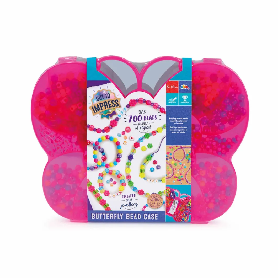 ¡Crea tu propio estilo! Con este exclusivo estuche de cuentas de mariposa de Out To Impress, crea tus propios collares, pulseras y más. ¡Comparte con tus mejores amigas! Hagamos hermosas joyas con más de 700 cuentas de diferentes colores, formas y tamaños. Este adorable estuche rosa con forma de mariposa contiene todo lo que necesitas para pasar horas de diversión en donde quiera que estes podras explotar tu creatividad.