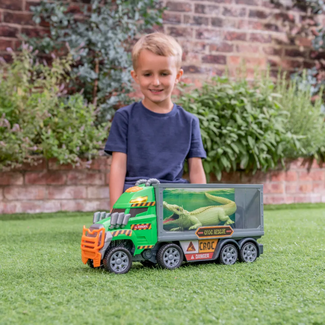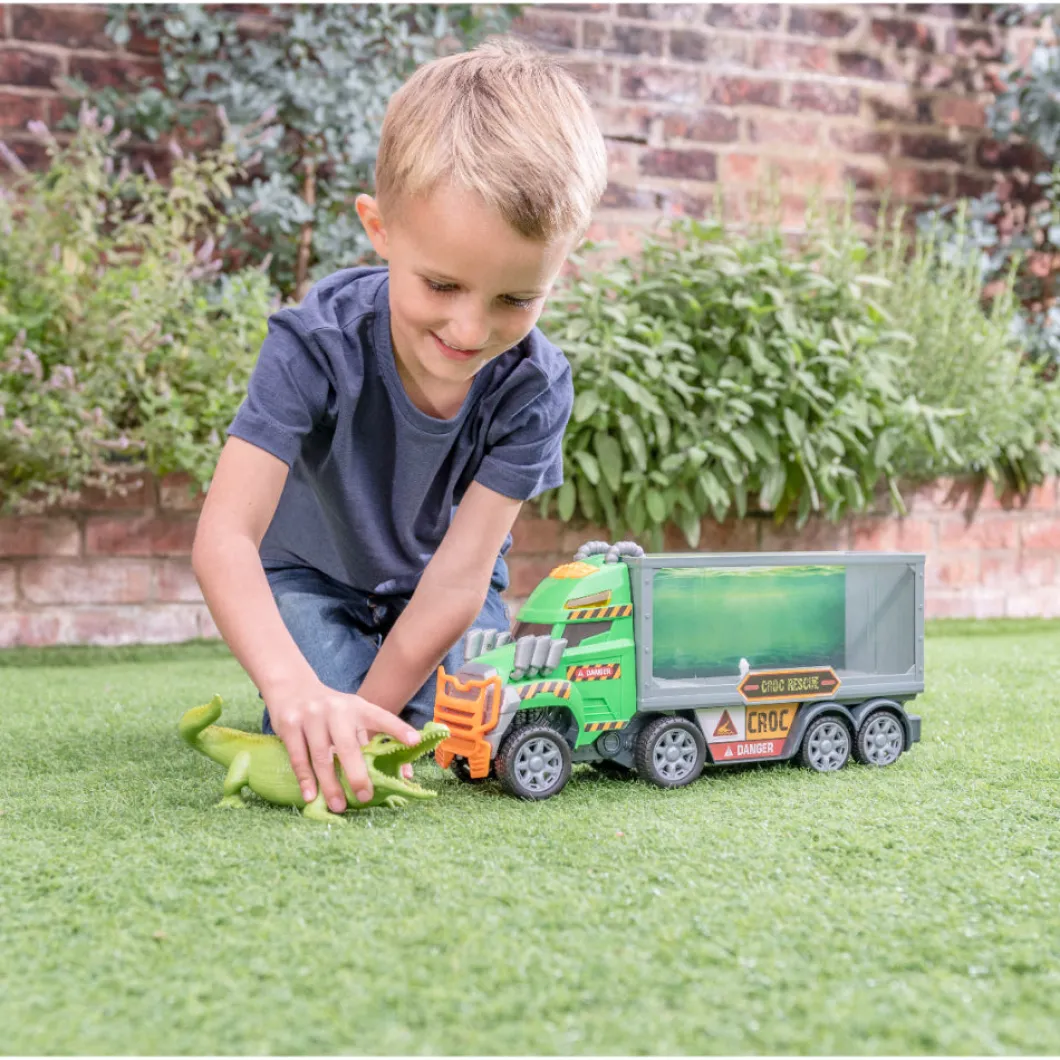 Teamsterz Monster Moverz Croc Rescue Truck viene con un tiburón extraíble y un camión de rescate de juguete con luces y sonidos. Presione los botones para escuchar música, alarmas y sonidos de salpicaduras de agua, así como luces delanteras parpadeantes. Este camión de rescate avanza con solo presionar un botón mientras el Croc se agita e intenta escapar del tanque. El regalo perfecto para cualquier pequeño conductor entusiasta, que ofrece horas de diversión imaginativa.