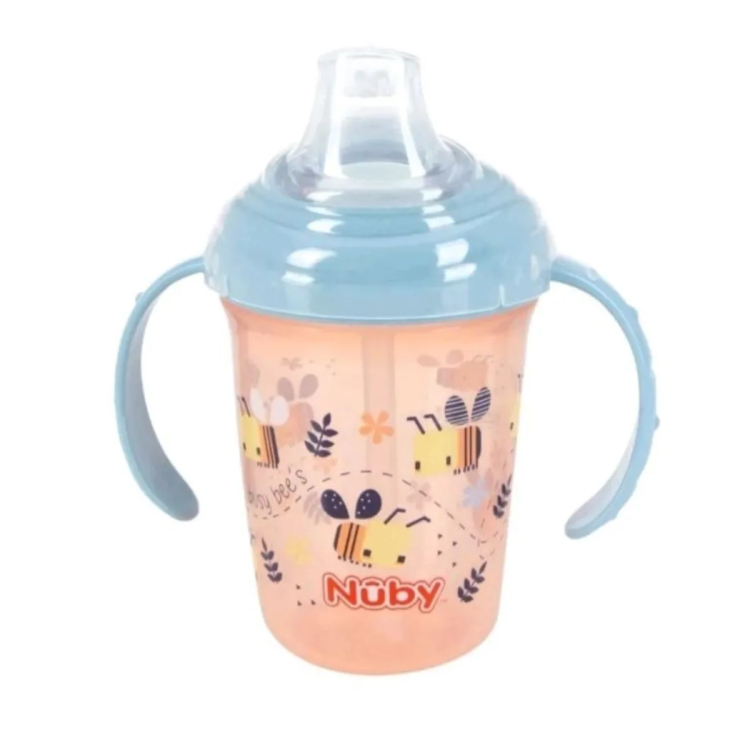 ¡Los primeros sorbos de tu bebé acompañados de Nuby! Con nuestro vaso de iniciación tu bebé se sentirá seguro y confiado ya que la boquilla de silicona suave y flexible, aprobada por el dentista es suave para los dientes pequeños y se siente como una tetina de biberón. ¡Evita derrames! gracias a sus asas de agarre y tapa, podras darle el vaso a tu bebe sin temer que lo derrame. Ademas, gracias a sus tiernos motivos tu bebe se motivara a beber de el sin miedo a dejar el biberon de lado.