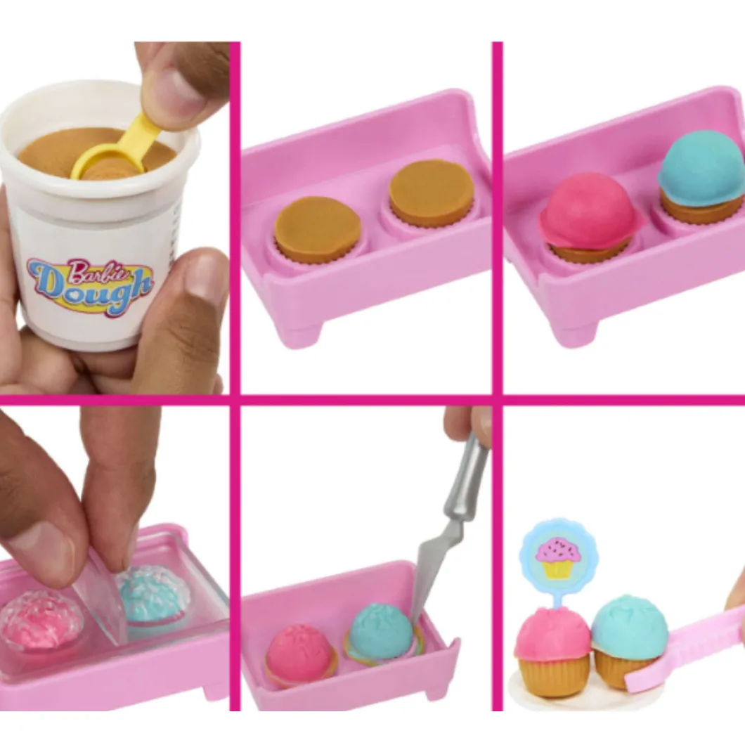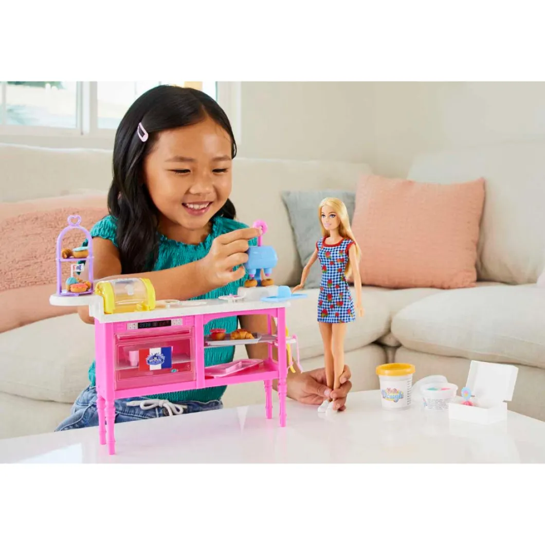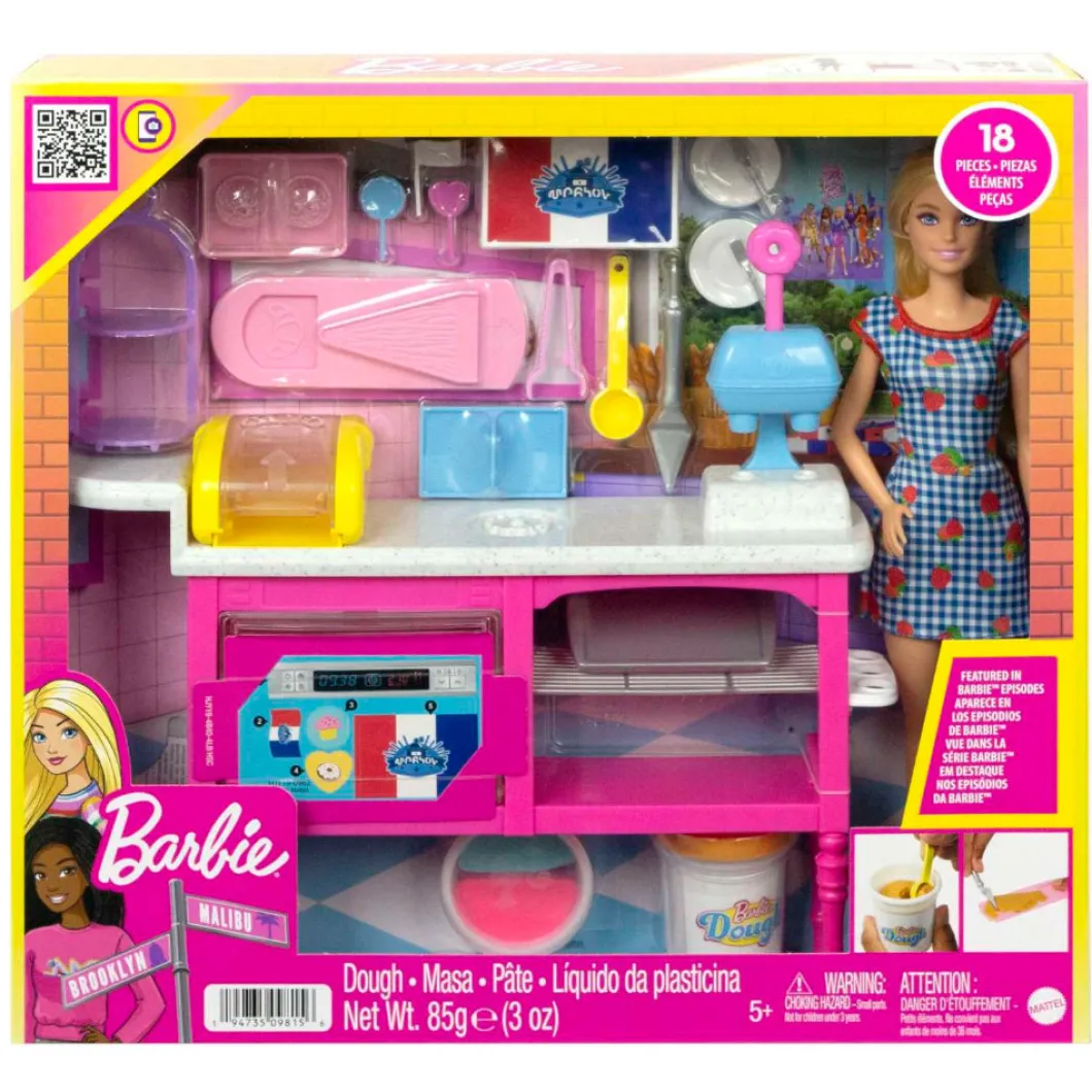 Los pequeños chefs pueden sumergirse en el emocionante mundo de la repostería con la muñeca Barbie «Malibú» Roberts y el emocionante conjunto It Takes Two, inspirado en momentos icónicos de cocina de la serie. El kit incluye tres colores de plastilina, moldes y utensilios de cocina que hacen que preparar y servir deliciosos pasteles, como cruasanes, magdalenas y dónuts, sea un juego de niños. Después de decorar y exhibir sus creaciones, los niños pueden empaquetarlas en una caja de transporte para recrear escenas o imaginar nuevas aventuras. Es importante recordar que la plastilina no es comestible y que la muñeca no puede mantenerse de pie por sí sola. Los colores y la decoración pueden variar para añadir aún más diversión.