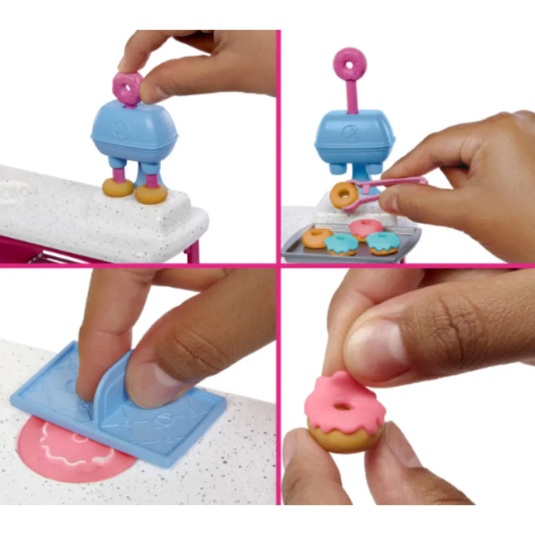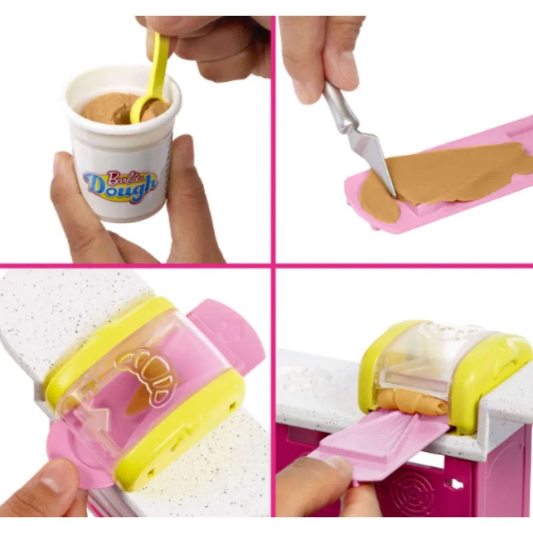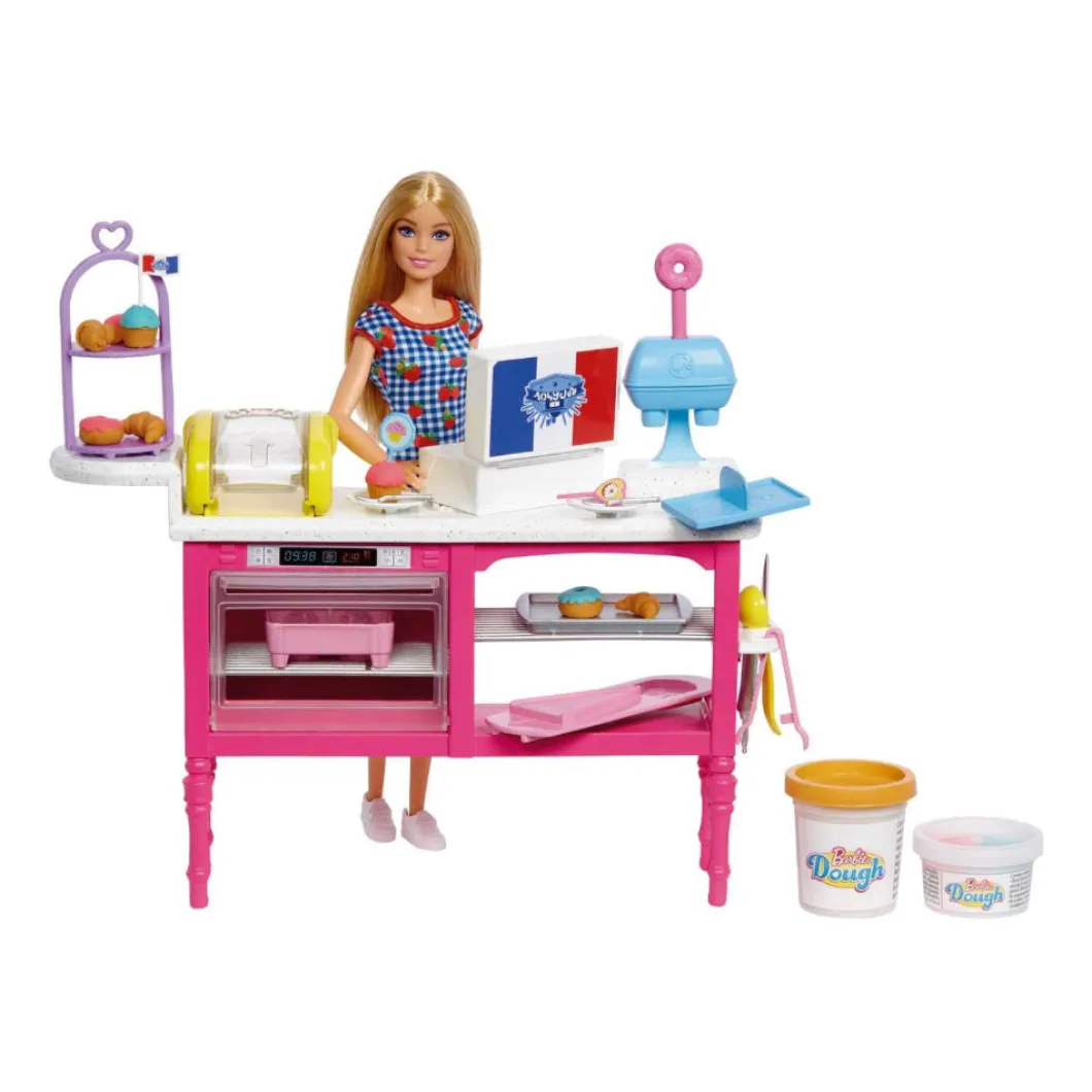 Los pequeños chefs pueden sumergirse en el emocionante mundo de la repostería con la muñeca Barbie «Malibú» Roberts y el emocionante conjunto It Takes Two, inspirado en momentos icónicos de cocina de la serie. El kit incluye tres colores de plastilina, moldes y utensilios de cocina que hacen que preparar y servir deliciosos pasteles, como cruasanes, magdalenas y dónuts, sea un juego de niños. Después de decorar y exhibir sus creaciones, los niños pueden empaquetarlas en una caja de transporte para recrear escenas o imaginar nuevas aventuras. Es importante recordar que la plastilina no es comestible y que la muñeca no puede mantenerse de pie por sí sola. Los colores y la decoración pueden variar para añadir aún más diversión.