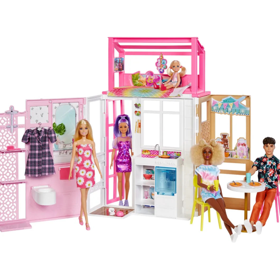 Barbie Casa Con Muñeca seguramente emocionará a las pequeñas princesas de hoy. ¡Con 360 grados de diversión, dos historias, cuatro áreas de juego y muchos accesorios para crear historias, te divertirás durante horas creando narraciones interminables con la gran muñeca Barbie y su adorable compañero canino! La casa completamente amueblada incluye un diseño moderno con el estilo característico de Barbie® y todo lo que las niñas necesitan para representar sus historias como una muñeca Barbie®, incluso un adorable perro. Pase el rato en la puerta principal, prepare la cena en la cocina o sirva la comida en la mesa para dos invitados. Después de jugar duro todo el día, las niñas pueden meter a Barbie® en la cama para una pijamada acogedora. ¡Los lindos muebles y accesorios inspiran el juego de contar historias en cualquier momento y en cualquier lugar! Cuando termina el tiempo de juego, se pliega fácilmente para guardarlo o para viajar.