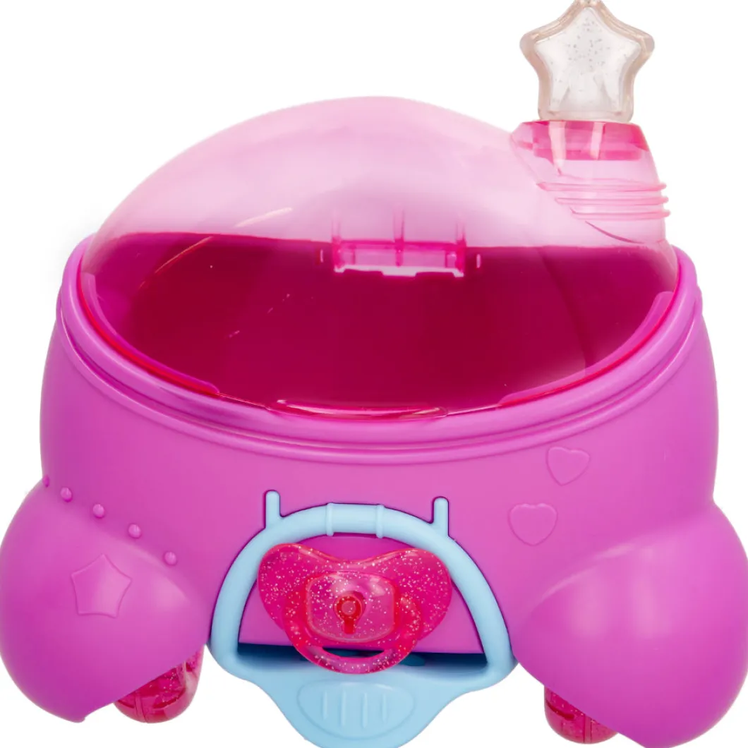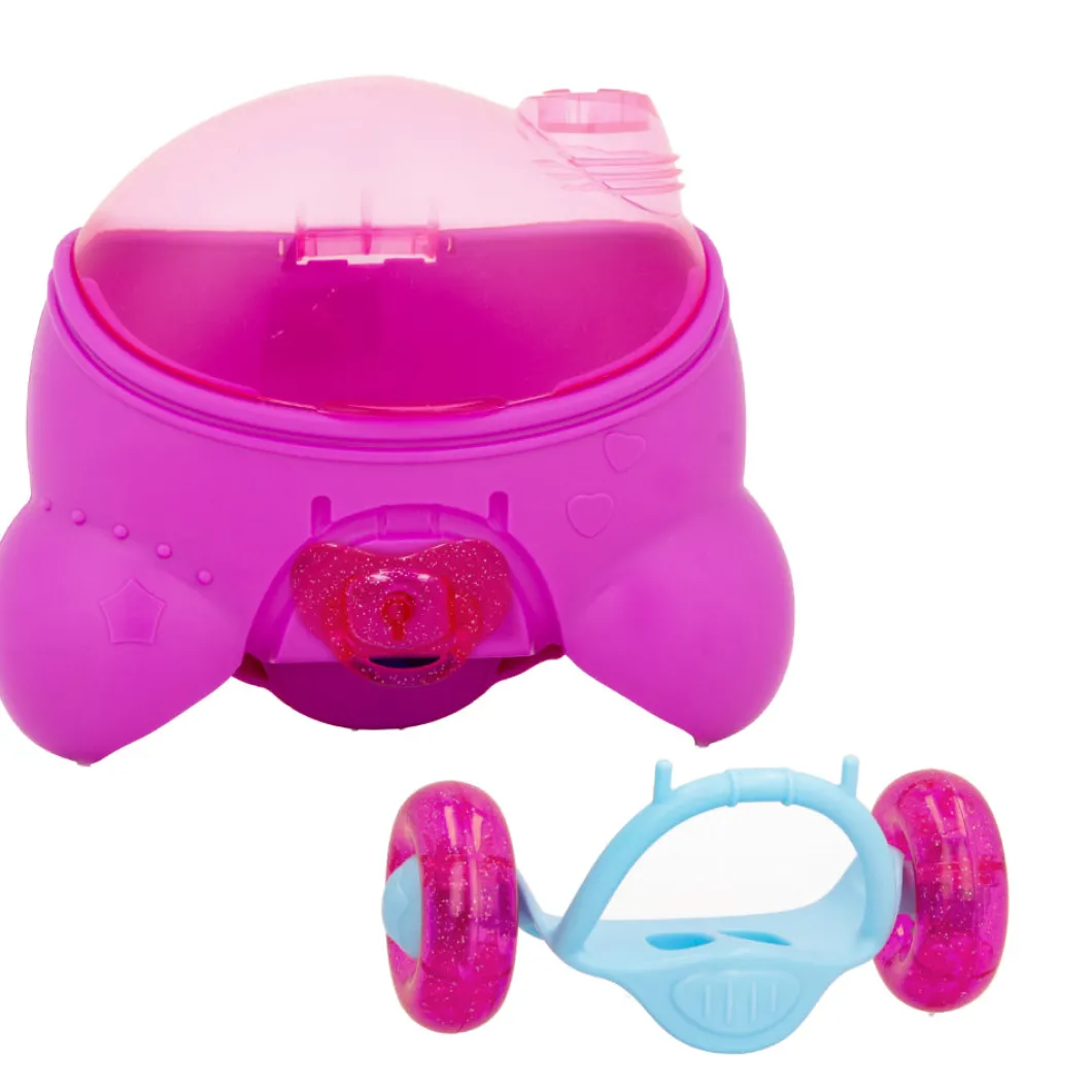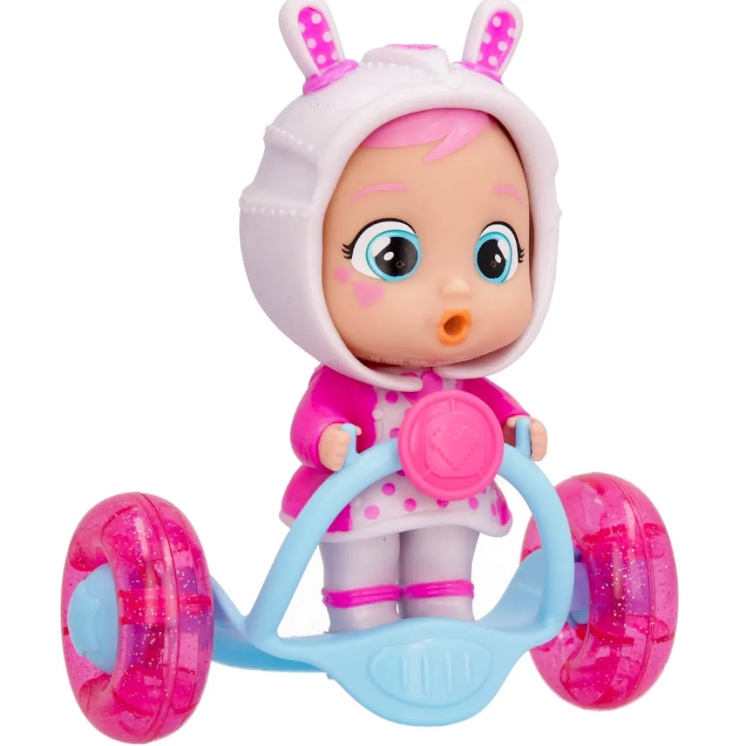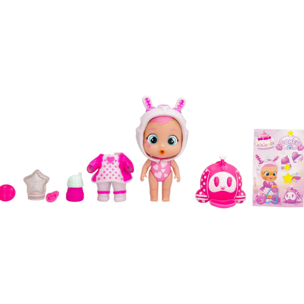 Cry Babies Magic Tears Stars Coneys House es un 2 en 1 con una casa púrpura brillante y ruedas desmontables que funcionan como segway para Coney. Coney viene con su propio traje de silicona extraíble y un cuerpo articulado. Alimenta a Coney con agua del biberón y ella llorará lágrimas reales. También puedes agregar agua a la estrella en la parte superior de su casa y brillará en la oscuridad.