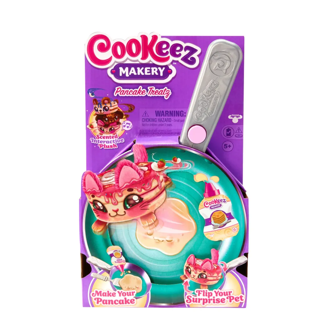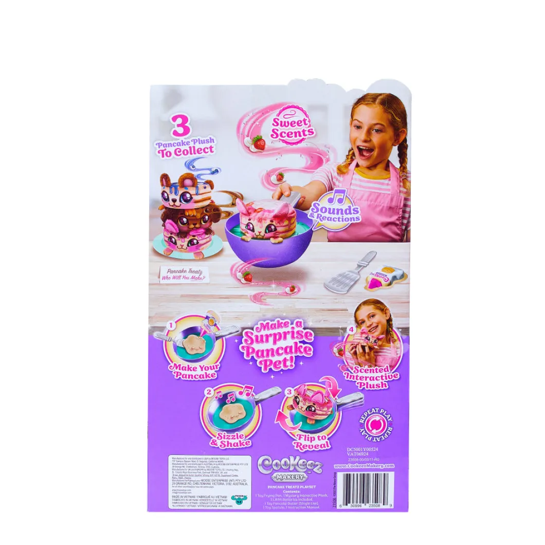 Cookeez Makery los sorprenderá a usted y a su hijo cuando le den la vuelta a un mejor amigo de peluche sorpresa. Mientras voltean la masa para panque en la sartén, descubrirán su propio amigo de peluche interactivo perfumado en forma de un delicioso panqueque con olor. Cookeez Makery Pancake Treatz viene con todo lo que los niños necesitan para preparar un panqueque sorpresa. Existe la posibilidad de hacer un oso, un gatito o un cachorro. Primero, exprimen la masa para panqueques en el centro de la sartén, luego agitan la sartén para escuchar un chisporroteo. Ahora, voltea la sartén para revelar la mascota de peluche sorpresa más linda de Pancake Treatz. ¡Guau! Un juguete de peluche deliciosamente perfumado con el que puedes jugar de forma interactiva. ¿Qué Pancake Treatz harán? Hay 3 para crear: Blue Beary, Strawberry Pankitty y Choc Flip Pup. Los niños pueden repetir el proceso una y otra vez.
