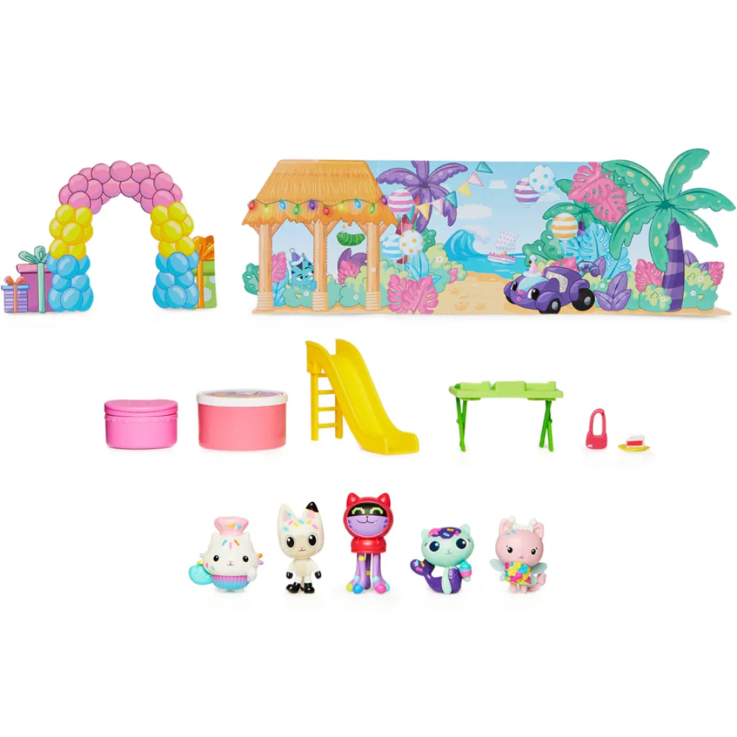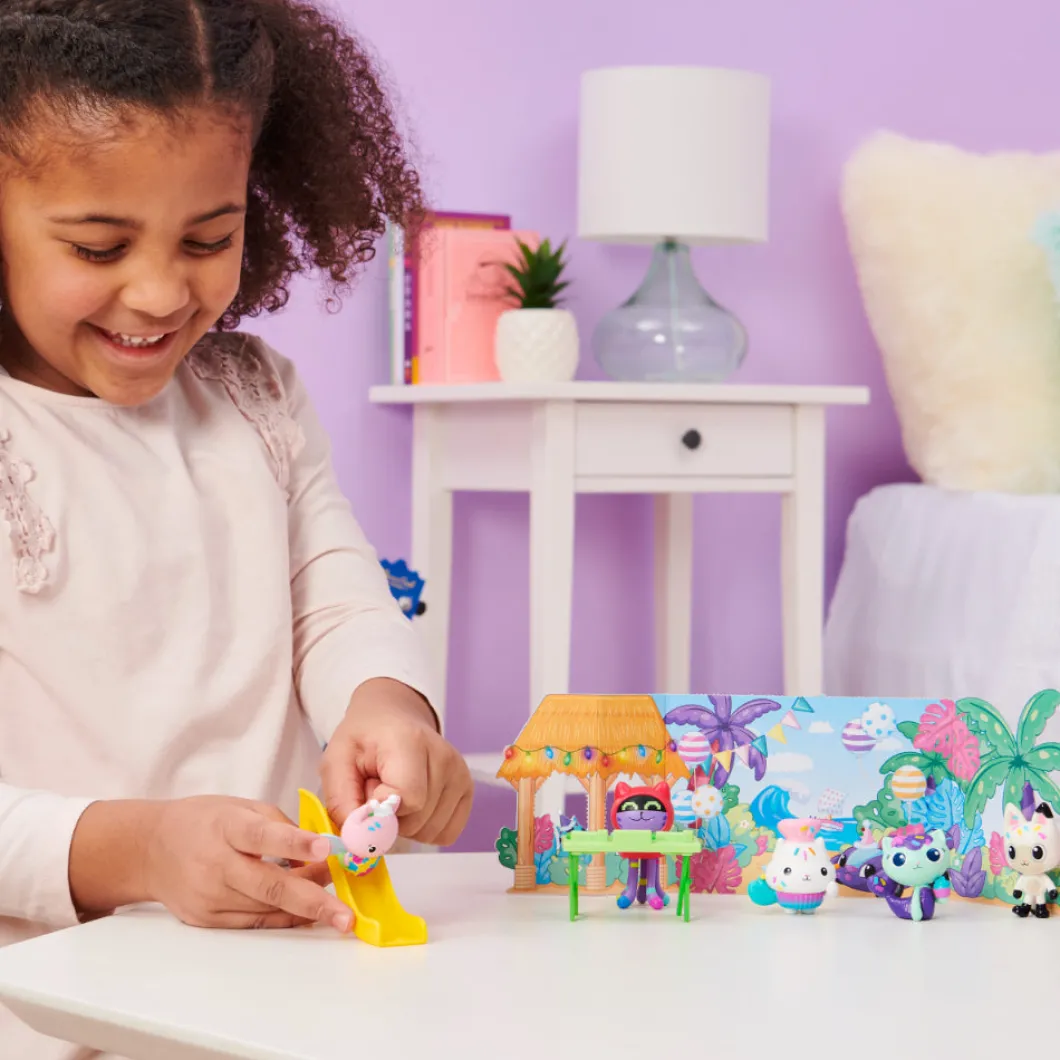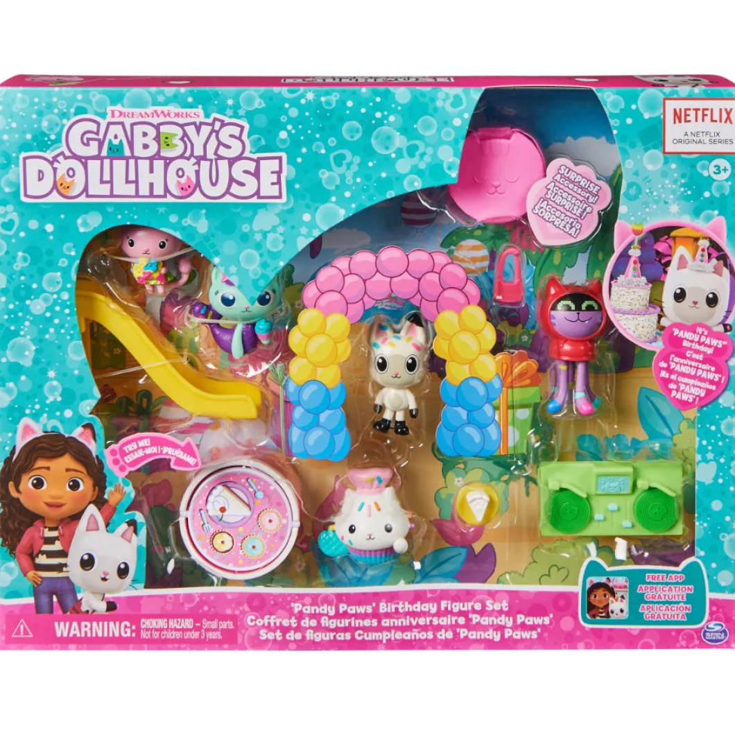 Es el cumpleaños de Pandy Patas. Celébralo con el Set de Cumpleaños de Pandy Patas de Gabby’s Dollhouse. Este conjunto temático tiene todo lo necesario para celebrar una fiesta para el mejor amigo de Gabby. Abre la caja y descubre cinco figuras coleccionables exclusivas con detalles de cumpleaños, tres muebles, dos accesorios, dos piezas de arte de cartón, una hoja de calcomanías y una caja sorpresa con un accesorio sorpresa en el interior. Al igual que hace Gabby en la serie, abre la caja sorpresa para descubrir el accesorio misterioso del conjunto. ¿Qué podrá ser? Monta el fondo de piezas de arte de cartón y el arco de globos para ayudar a decorar la fiesta y reunir a todos los amigos de Gabby. Pon el accesorio a Pandy Patas y que empiece la fiesta. Ayuda a Daniel James «DJ» Musicat a poner canciones en el tocadiscos, los discos se mueven de verdad. Juega en el tobogán con Hada Gatina, y luego ve a la mesa a disfrutar de un delicioso pastel horneado por Pastelillo. Da la vuelta a la mesa para descubrir golosinas y regalos de cumpleaños en ambos lados. Saca una foto de Pandy Patas y Gatirena bajo el arco de globos y continúa divirtiéndote en el cumpleaños durante todo el día. Haz crecer el mundo de Gabby’s Dollhouse y combina el Set con la Casa de Muñecas de Gabby (se vende por separado). Como última sorpresa, escanea el código QR que encontrarás en el interior de la caja sorpresa para desbloquear una recompensa especial en la aplicación gratuita de Gabby’s Dollhouse (disponible en iOS y Android). El Set es el regalo perfecto para niños y fans de la serie. Llévate a casa el Set de Gabby’s Dollhouse y organiza una fiesta de cumpleaños gatástica.
