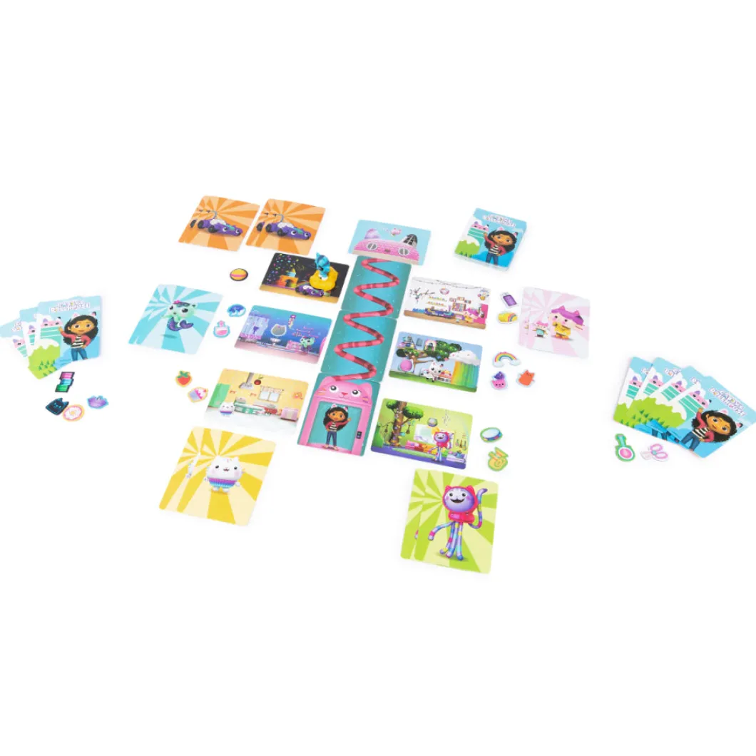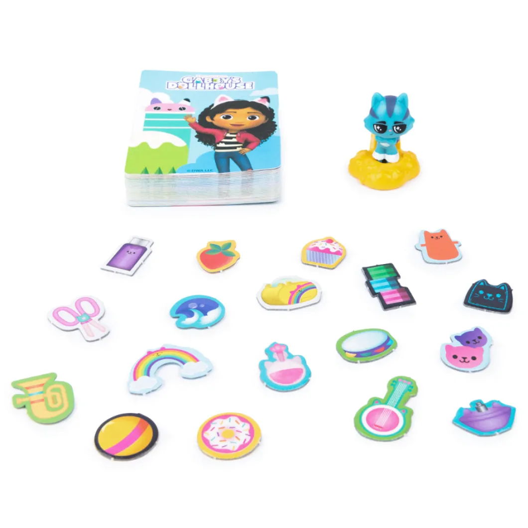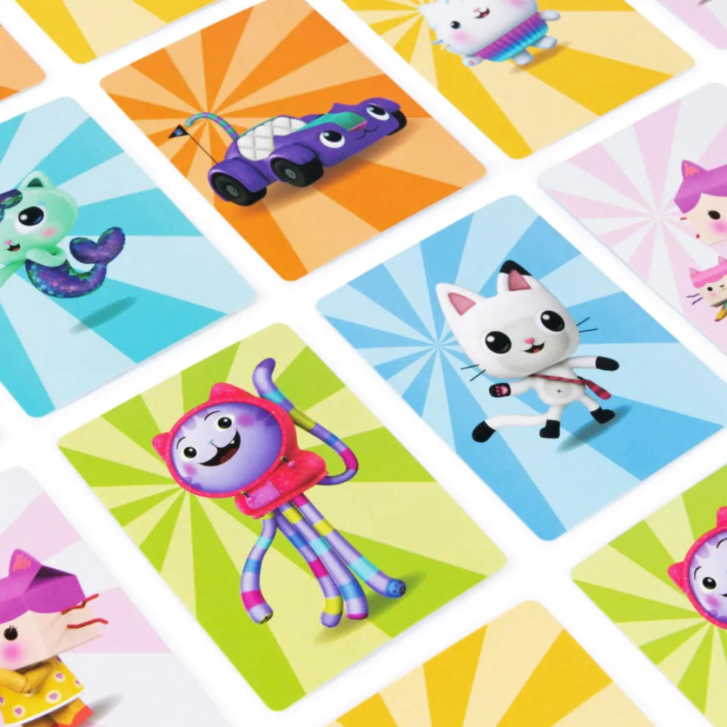 ¡Atención, fans de Gabby’s Dollhouse! Con este alegre y colorido juego de cartas, los jugadores exploran la casa de muñecas y deben unir las cartas de los personajes con las cartas de la casa de muñecas. ¡Manten la concentración y descubre los pares! Este juego ayudara a que tu hijo trabaje la concentración y desarrolle sus habilidades motoras. El objetivo del juego es hacer tantas coincidencias de sala de personajes como sea posible mientras se mueve el peón CatRat al techo del castillo de naipes. Gana el primero en llegar con CatRat.