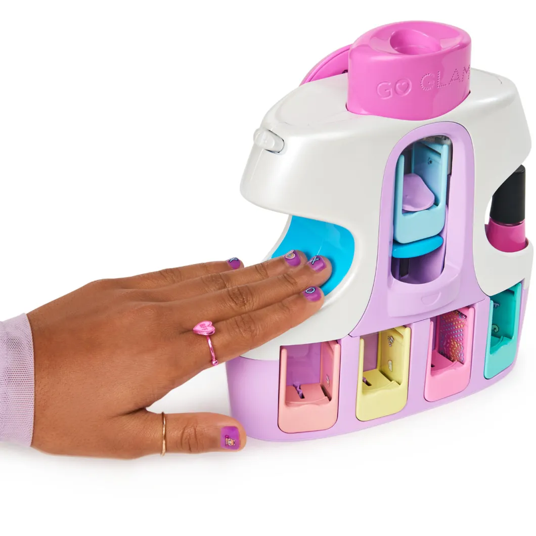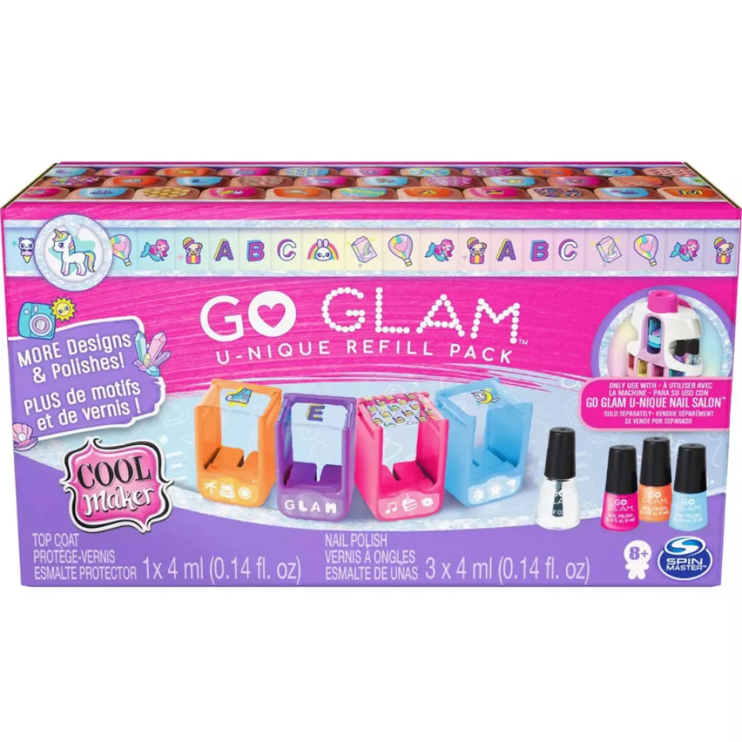 Este kit GO Glam y paquete de repuestos es el accesorio perfecto para tu propio salón de uñas. Crea manicuras con diseños de calidad de salón en casa con U-nique Nail Salon y este kit divertido y fácil de usar. Simplemente seleccione un paquete de recarga de calcomanías, colóquelas en la máquina, pinte sus uñas con esmalte para niños no tóxico GO GLAM, coloque su mano debajo de la secadora, enciéndala y espere cinco minutos para que sus uñas se sequen. Luego, gire el dial en la máquina para ir de un ícono a otro hasta que encuentre el que desea. Finalmente, inserte el dedo en la máquina y presione hacia abajo para sellar la pegatina en la uña.