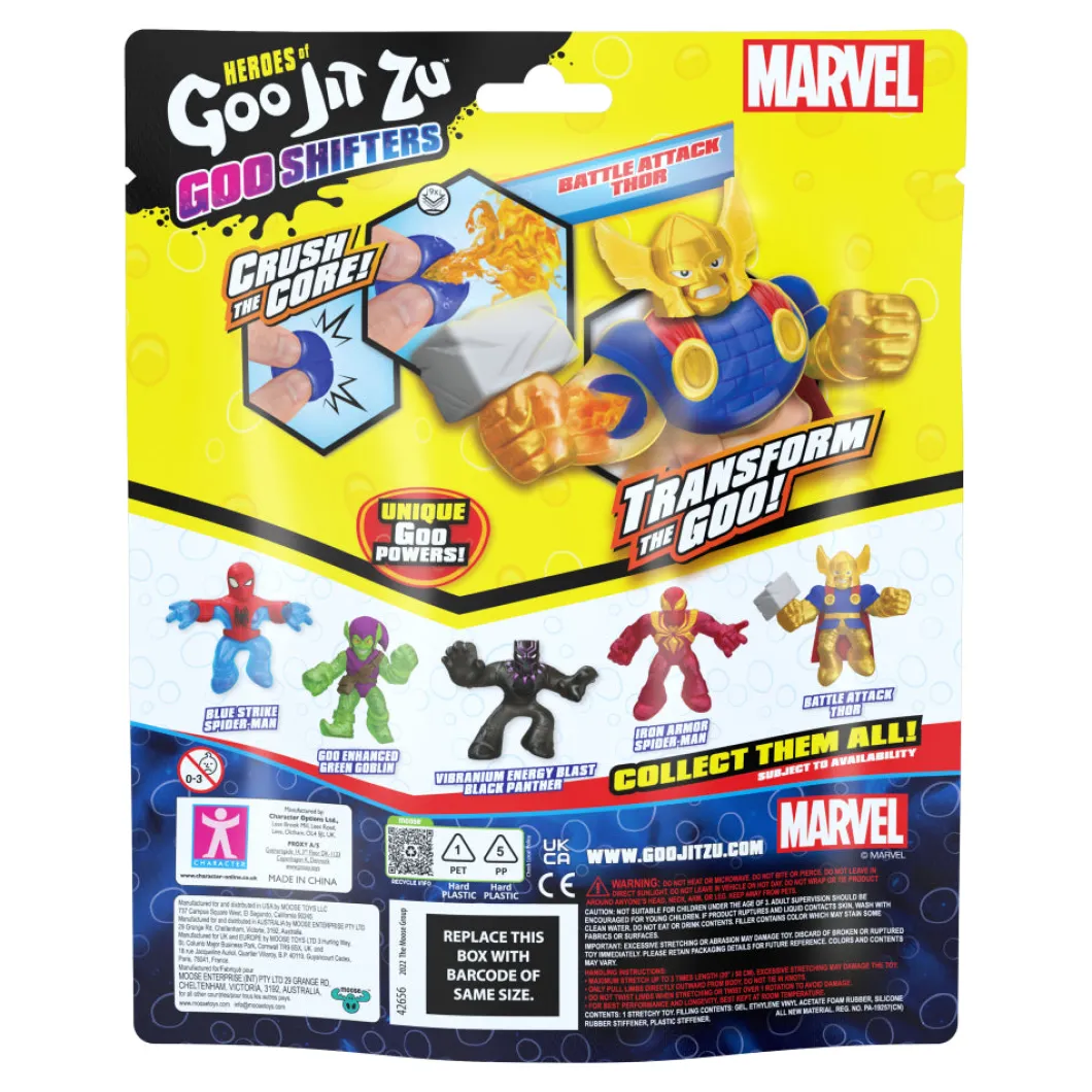 Prepárate para una acción potenciada con los héroes de Goo Jit Zu que se encuentran con los superhéroes de Marvel! Ahora son un «Goo Shifter»: ¡aplasta el núcleo para transformar el Goo! Estos heroes súper blandos están listos para recibir más poder al aplastar el núcleo dentro de su cuerpo. Cuando se aplasta el núcleo de Goo Enhanced, se activa una transformación asombrosa en todo su relleno de Goo. ¡Los niños se sorprenderán al ver cómo el Goo de colores se mueve y se extiende por su cuerpo! ¡Cada figura tiene un relleno de sustancia viscosa único y una «formación de sustancia viscosa»!