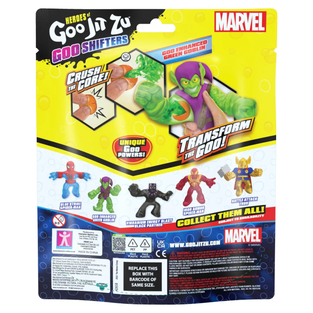 Prepárate para una acción potenciada con los héroes de Goo Jit Zu que se encuentran con los superhéroes de Marvel! Ahora son un «Goo Shifter»: ¡aplasta el núcleo para transformar el Goo! Estos heroes súper blandos están listos para recibir más poder al aplastar el núcleo dentro de su cuerpo. Cuando se aplasta el núcleo de Goo Enhanced, se activa una transformación asombrosa en todo su relleno de Goo. ¡Los niños se sorprenderán al ver cómo el Goo de colores se mueve y se extiende por su cuerpo! ¡Cada figura tiene un relleno de sustancia viscosa único y una «formación de sustancia viscosa»!