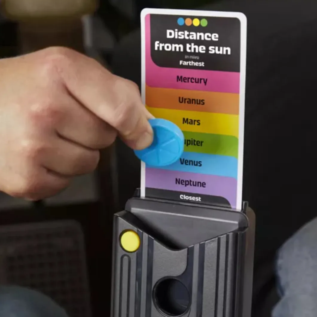 En el juego de fiesta Drop Trivia, los jugadores tienen todas las respuestas, ¡solo tienen que soltarlas en orden! Este juego de trivia electrónico de acción rápida se juega en tan solo 15 minutos. Cada equipo se turna para intentar adivinar el orden correcto de las respuestas para sumar puntos. Por ejemplo, clasifica 6 álbumes de debut del menos reciente al más reciente. Los jugadores hacen sus conjeturas soltando discos en la torre y ganan puntos por las respuestas en los lugares correctos. Para una experiencia similar a la de un programa de juegos, la torre guía a los jugadores a través del juego con comandos de voz y efectos de sonido. ¡Después de 4 rondas, el equipo con más puntos gana!