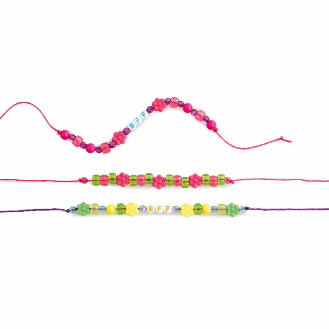 Comienza eligiendo entre hilo o cordón elástico, luego pasa horas enhebrando cuidadosamente muchas cuentas, incluidas cuentas del alfabeto, para hacer lindas joyas para ti y tus mejores amigas.