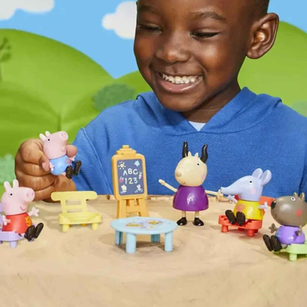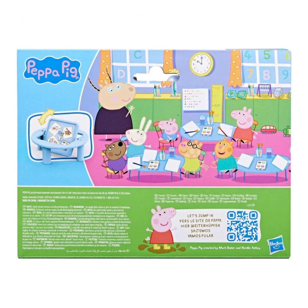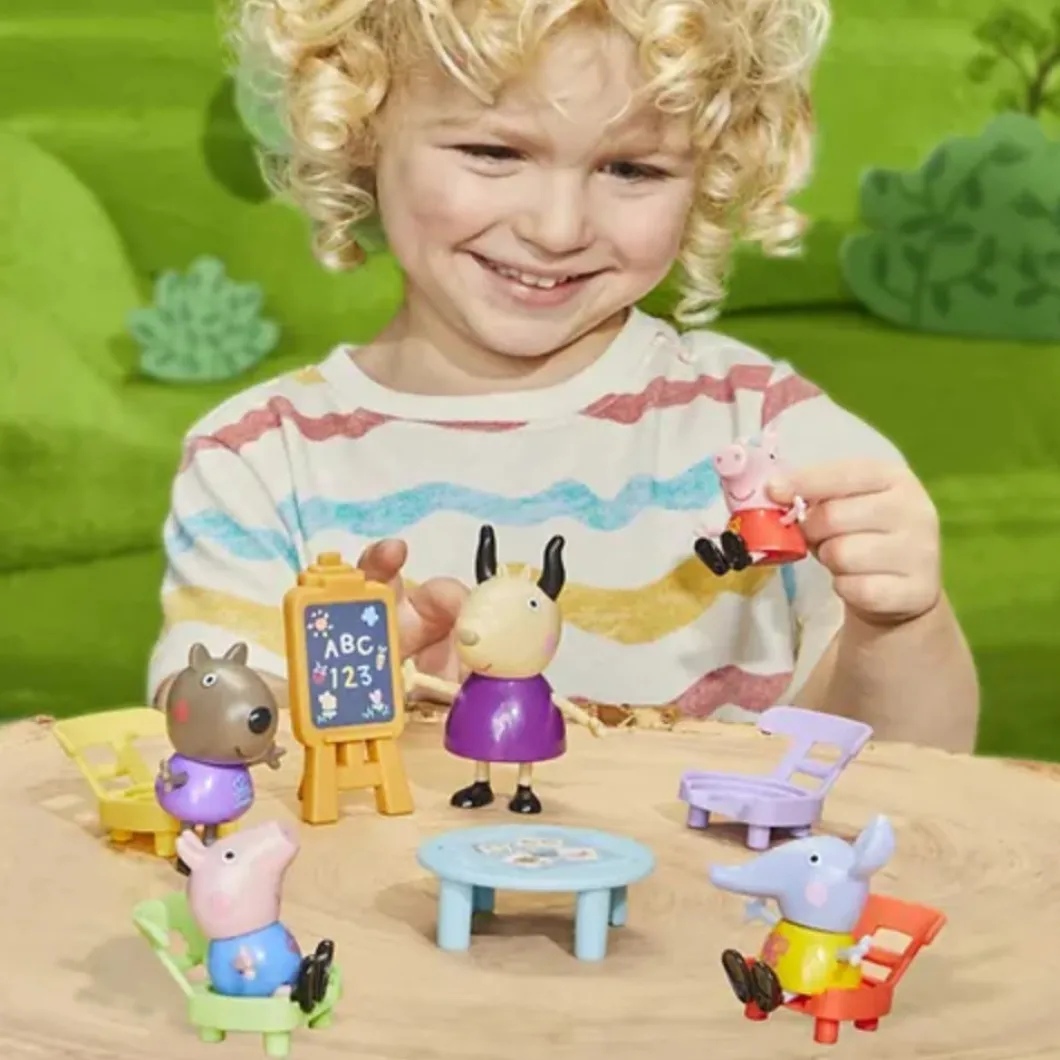 Los pequeñines pueden imaginar cómo serán sus días cuando vayan a la escuela con juguetes como La guardería de Peppa. Con 5 figuras, incluida la maestra Señora Gacela, así como una mesa y sillas y una pizarra, ¡los niños pueden imaginar la hora de jugar, la hora del almuerzo e incluso la hora de aprender! Las figuras pueden ponerse sentadas en las sillas, y las mesas giran para imaginar una clase de manualidades y la hora del almuerzo.
