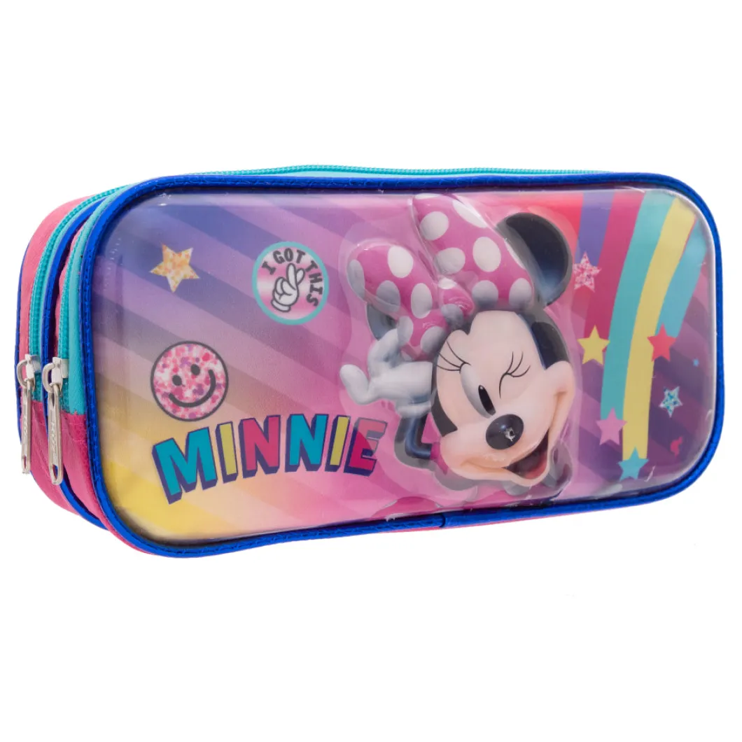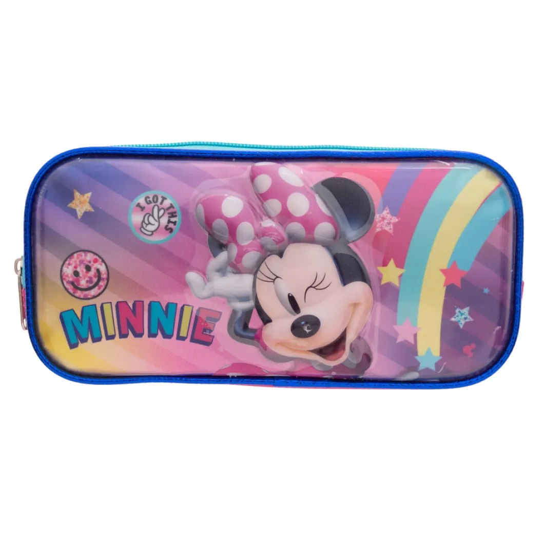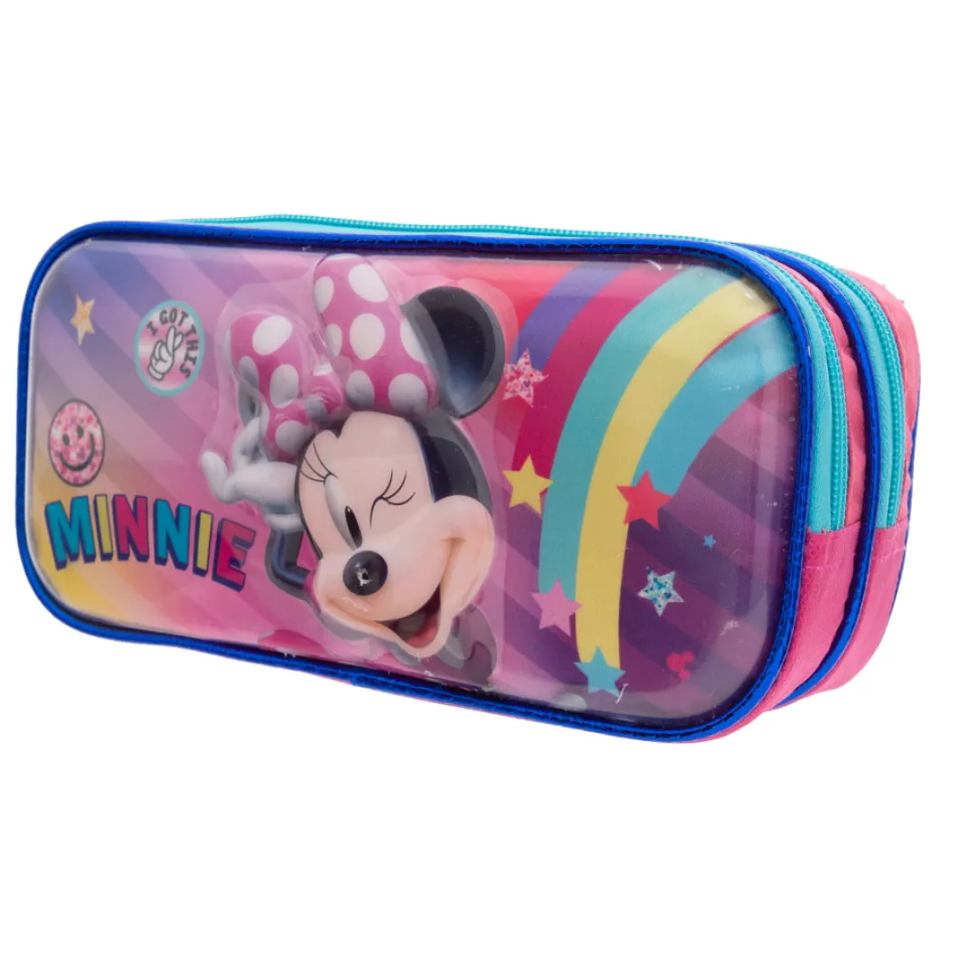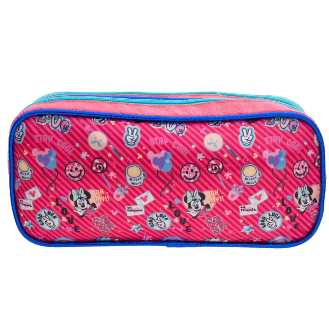 lleva tus lápices con la lapicera Minnie con su doble compartimiento podrás cargar mayor cantidad de lápices y de una manera organizada, su material es resistente, correderas con motivos de los lazos de minnie , el bolsillo delantero cuenta con un corazón liquido con figuras en la parte de adentro esta espectacular lapicera encuéntrala en tu tienda toysmart