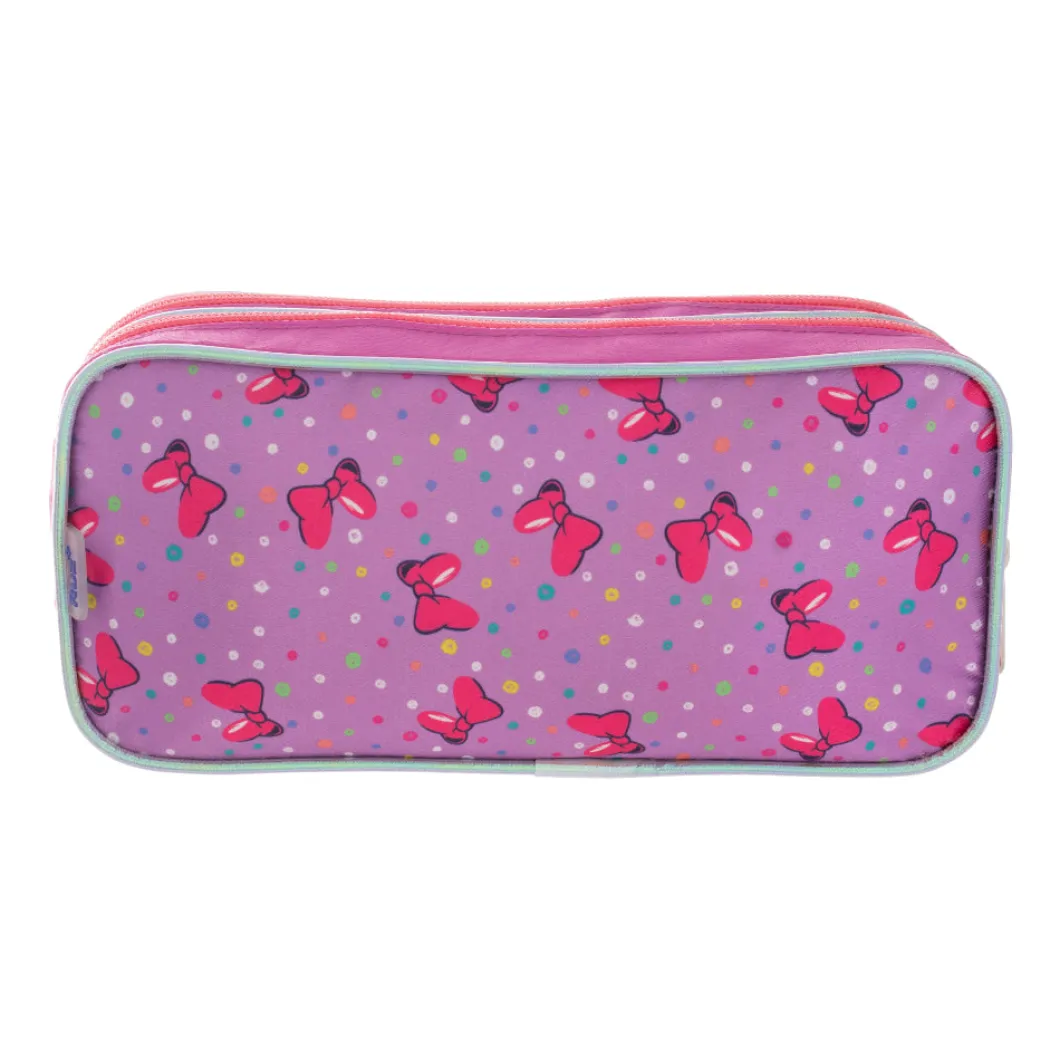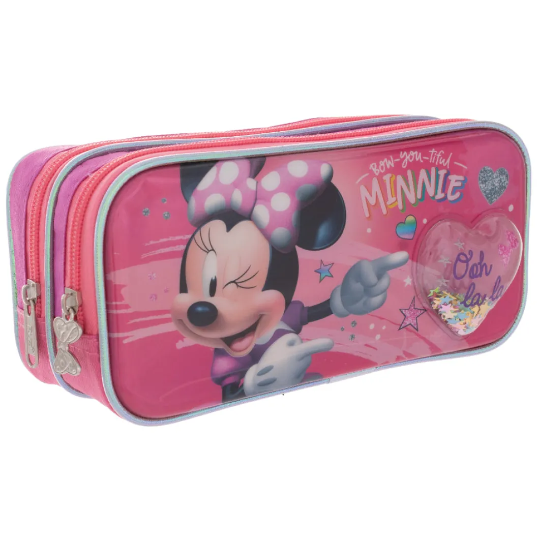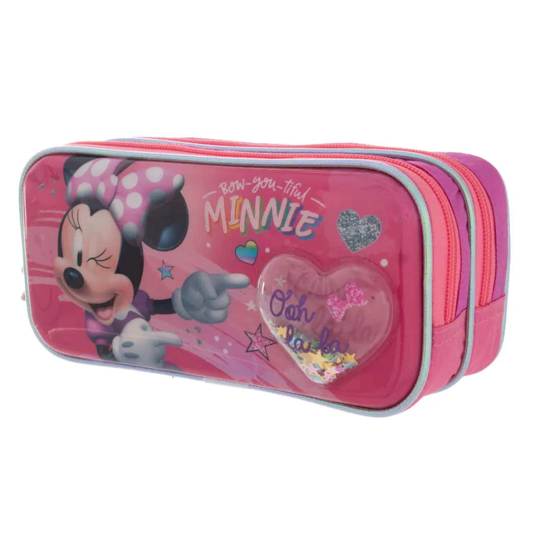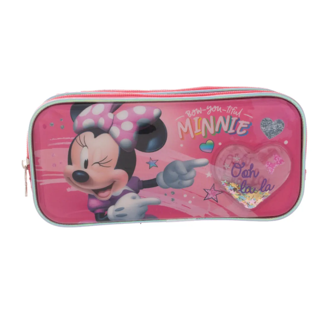 lleva tus lápices con la lapicera Minnie con su doble compartimiento podrás cargar mayor cantidad de lápices y de una manera organizada, su material es resistente, correderas con motivos de los lazos de minnie , el bolsillo delantero cuenta con un corazón liquido con figuras en la parte de adentro esta espectacular lapicera encuéntrala en tu tienda toysmart