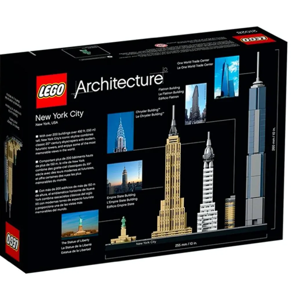 Este set reproduce el edificio Flatiron, el edificio Chrysler, el edificio Empire State, el complejo One World Trade Center y la Estatua de la Libertad, y posee una placa decorativa con la etiqueta “New York City” (Ciudad de Nueva York).