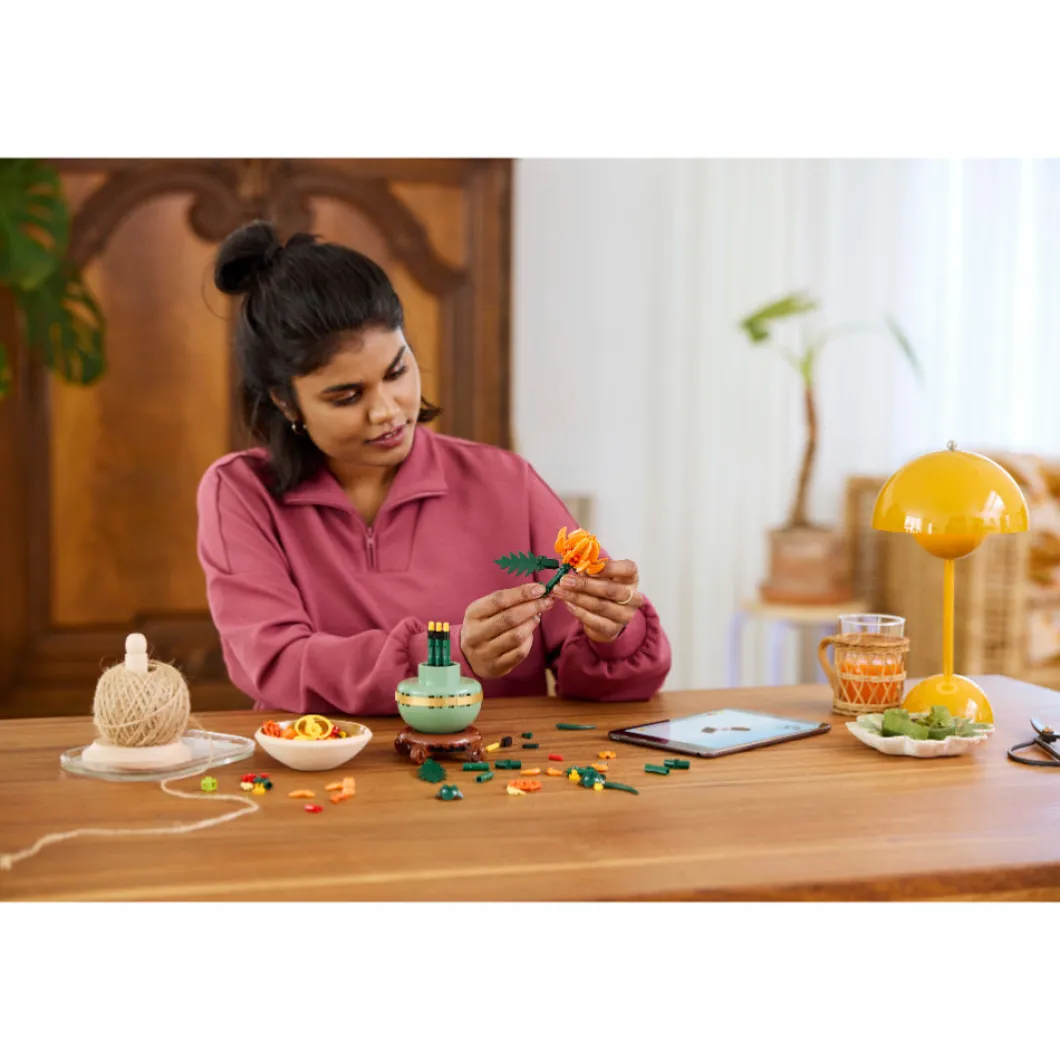 Relájate con el adorno floral del set de construcción para adultos LEGO® Icons Crisantemo (10368). El crisantemo es un motivo popular en el arte tradicional y simboliza el otoño en los “Cuatro Caballeros”, un cuarteto clásico de bellas plantas. Disfruta de un fascinante proyecto de construcción u obsequia a alguien especial con este adorno floral atemporal: un regalo perfecto para cualquier ocasión. Esta réplica detallada, con hojas y pétalos articulados, incluye vivas flores naranjas en capullo, abriéndose y abiertas, así como una maceta verde pastel con una banda dorada y una peana que imita la madera. Este modelo de crisantemo, fácil de construir, es un adorno elegante para cualquier espacio, tanto solo como junto a otros sets de la colección LEGO Botanical (se venden por separado). Descubre un espacio de relajación con los originales proyectos de construcción creativa LEGO para adultos. Las instrucciones de construcción digitales están disponibles en la app LEGO Builder.