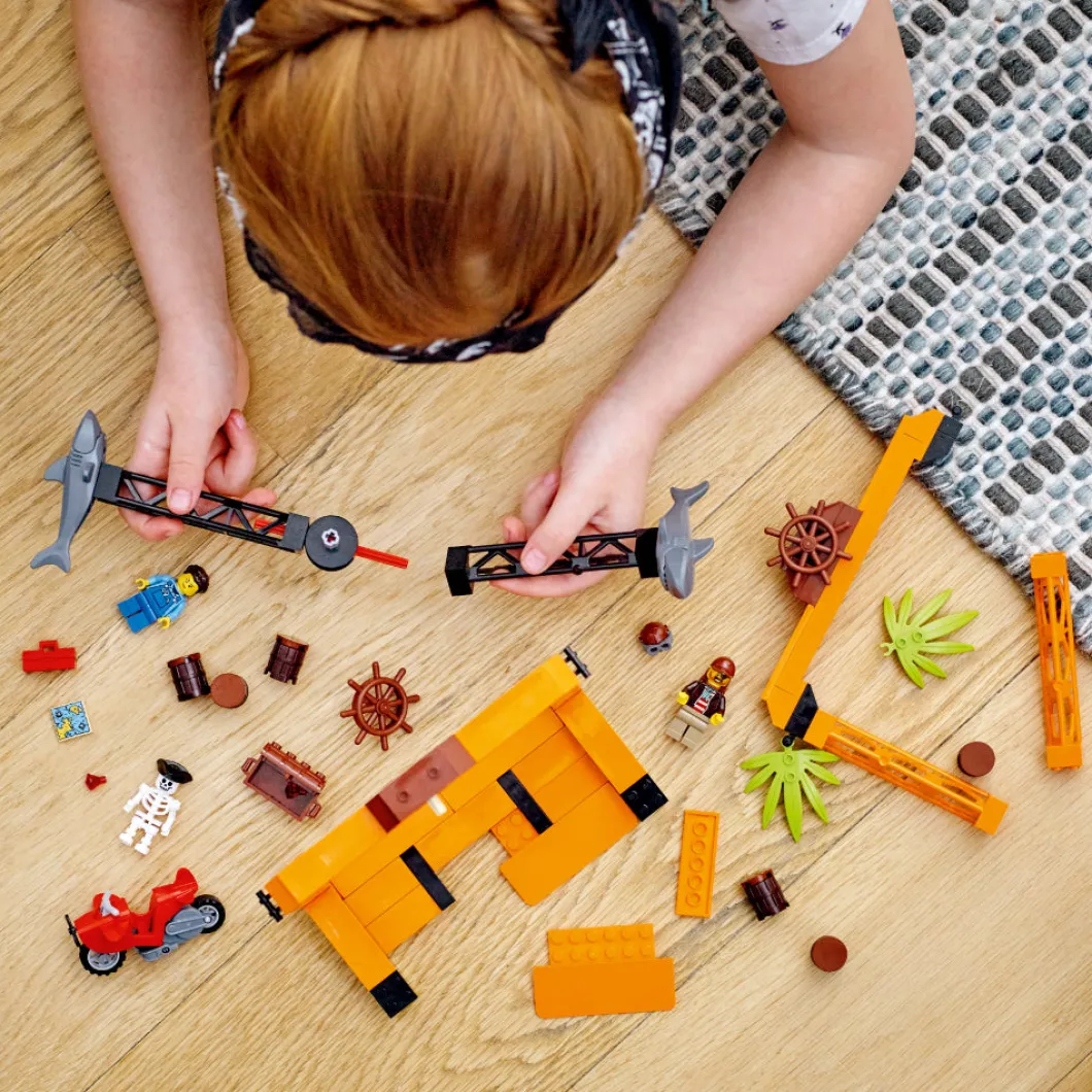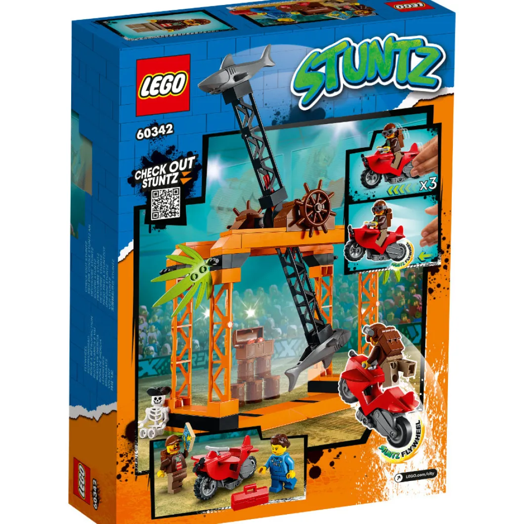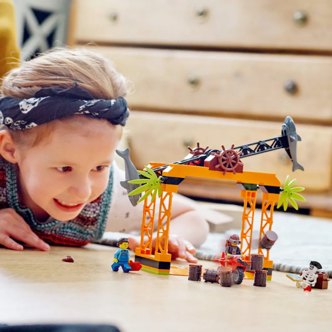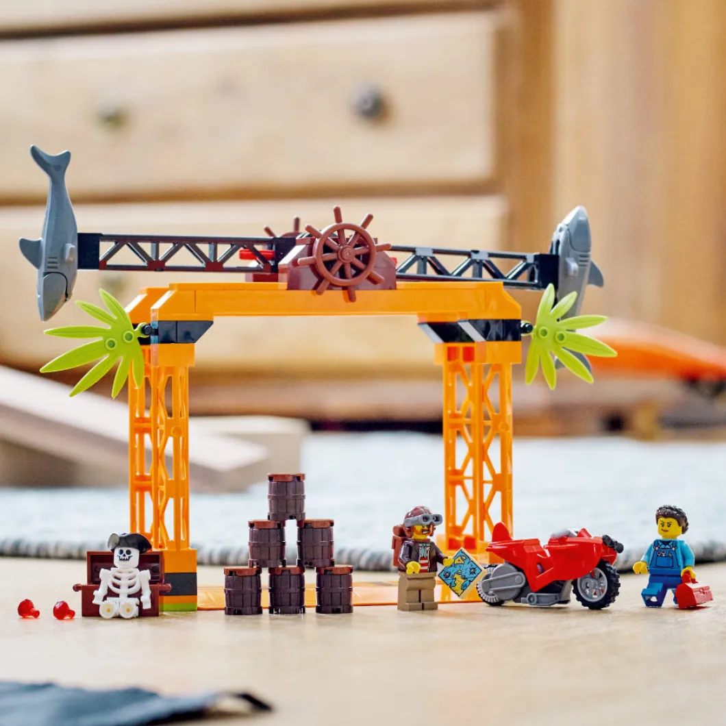 Intensifica el juego repleto de acción con este set LEGO® City The Shark Attack Stunt Challenge (60342). Los niños activan y lanzan la moto volante, evitando el esqueleto y la rueda giratoria del tiburón, para golpear los barriles y revelar un cofre del tesoro pirata escondido. Simplemente agregue las 2 minifiguras, incluido Chuck D. Goldberg de LEGO City TV, para horas de juego de roles imaginativo.