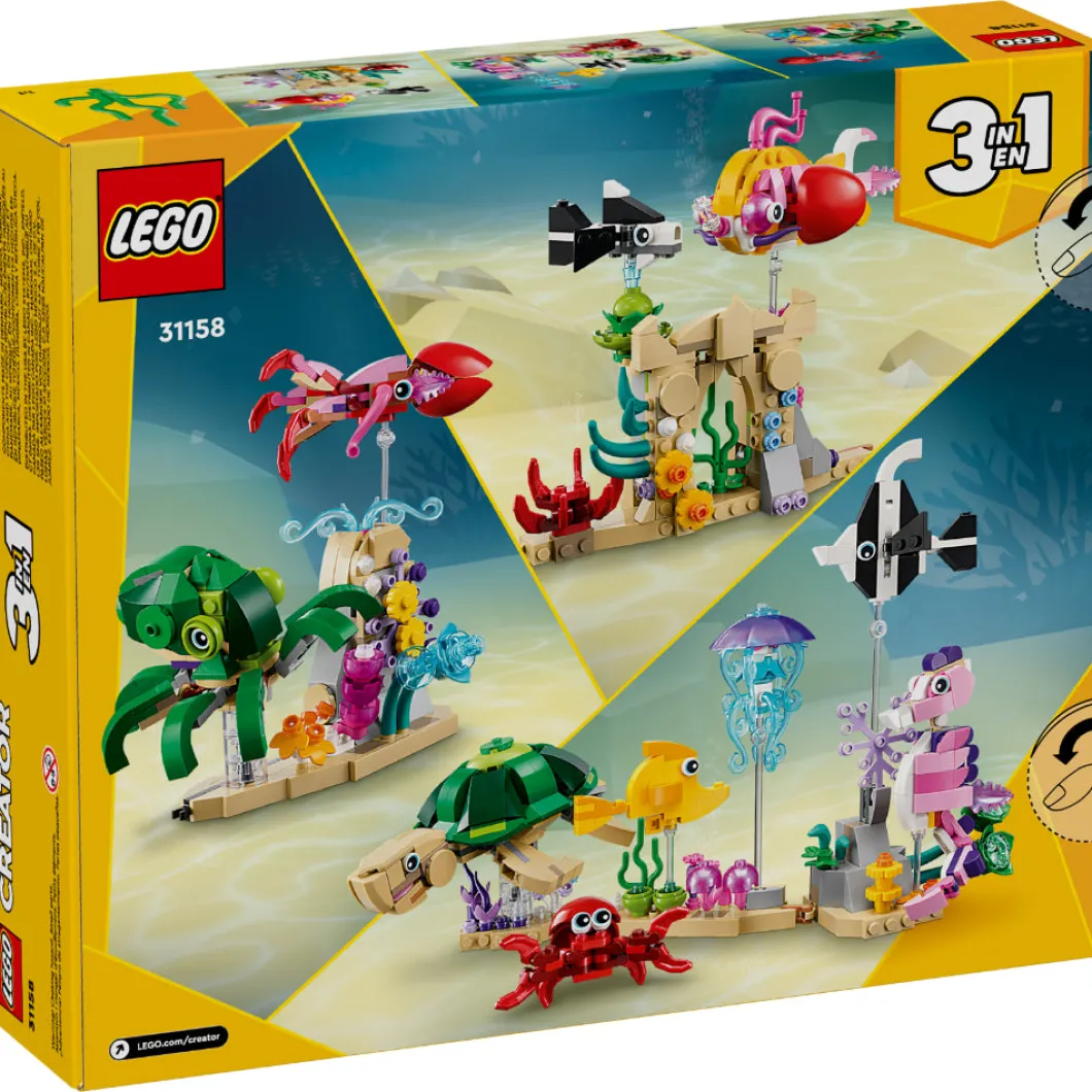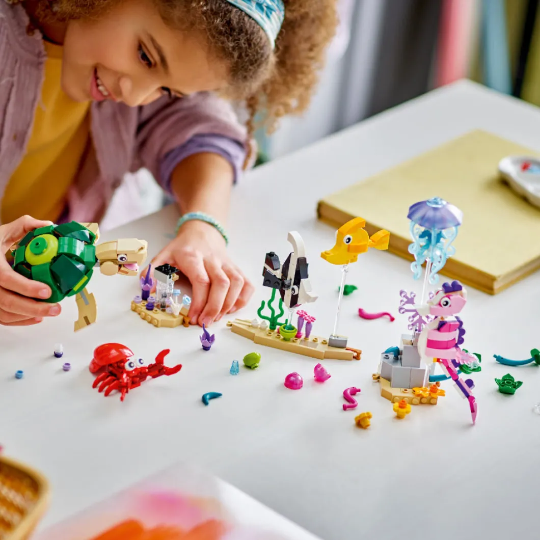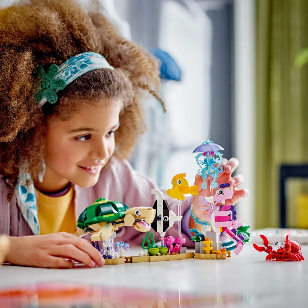 El vistoso set LEGO® Creator 3en1 Animales Marinos (31158) invita a los niños y las niñas de 8 años o más a construir y exponer decorativos modelos, ¡y a jugar con ellos! Incluye 2 peces, una tortuga, una medusa y un caballito de mar de juguete expuestos sobre varillas transparentes en una base que representa el fondo del mar, adornada con plantas marinas y en la que también hay una figura de un cangrejo rojo. Crea la base en línea recta o en ángulo y cambia de lugar las criaturas marinas que van en ella. Los fans de LEGO pueden elegir entre 3 escenas submarinas construibles con este juego de juguetes 3en1: una colección de 6 animales marinos en una base que representa el fondo del mar; un pulpo y un calamar junto a una roca volcánica borboteante, o 2 peces nadando entre coloridas plantas marinas. Los juguetes LEGO Creator 3en1 son regalos geniales. A los niños les encantará construir y reconstruir los 3 modelos posibles de cada caja, ¡o jugar con todos ellos a la vez comprando 3 sets!
