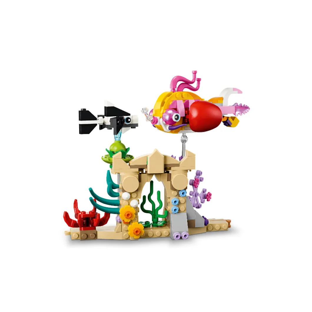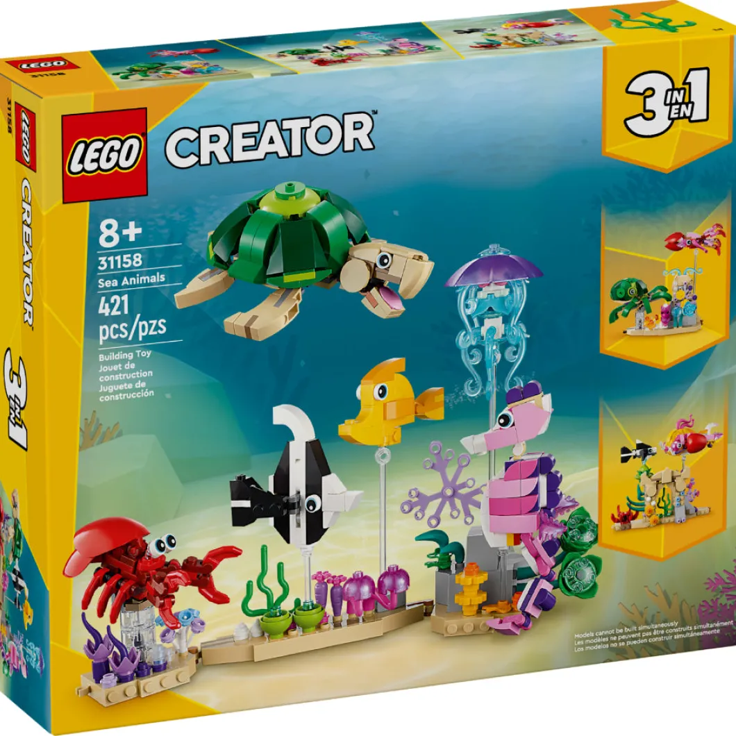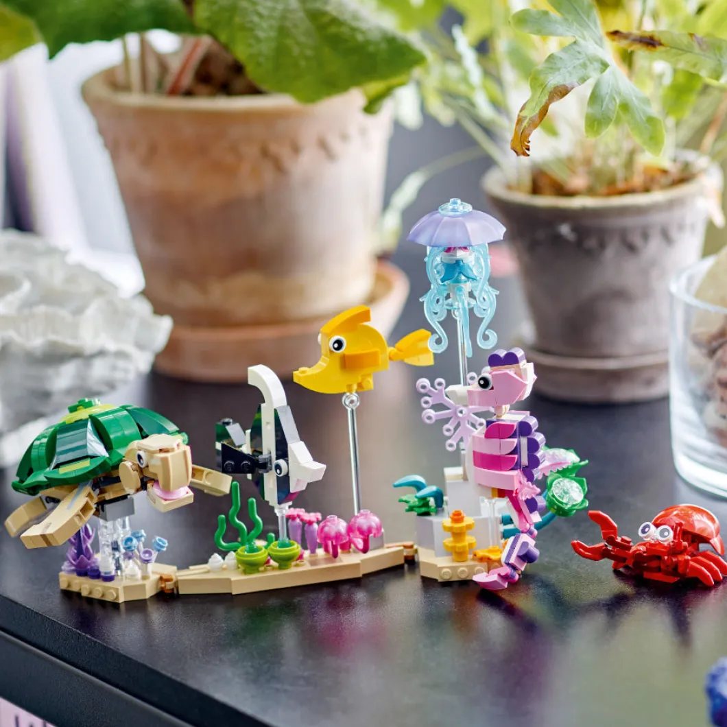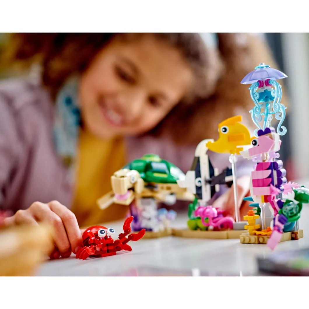 El vistoso set LEGO® Creator 3en1 Animales Marinos (31158) invita a los niños y las niñas de 8 años o más a construir y exponer decorativos modelos, ¡y a jugar con ellos! Incluye 2 peces, una tortuga, una medusa y un caballito de mar de juguete expuestos sobre varillas transparentes en una base que representa el fondo del mar, adornada con plantas marinas y en la que también hay una figura de un cangrejo rojo. Crea la base en línea recta o en ángulo y cambia de lugar las criaturas marinas que van en ella. Los fans de LEGO pueden elegir entre 3 escenas submarinas construibles con este juego de juguetes 3en1: una colección de 6 animales marinos en una base que representa el fondo del mar; un pulpo y un calamar junto a una roca volcánica borboteante, o 2 peces nadando entre coloridas plantas marinas. Los juguetes LEGO Creator 3en1 son regalos geniales. A los niños les encantará construir y reconstruir los 3 modelos posibles de cada caja, ¡o jugar con todos ellos a la vez comprando 3 sets!