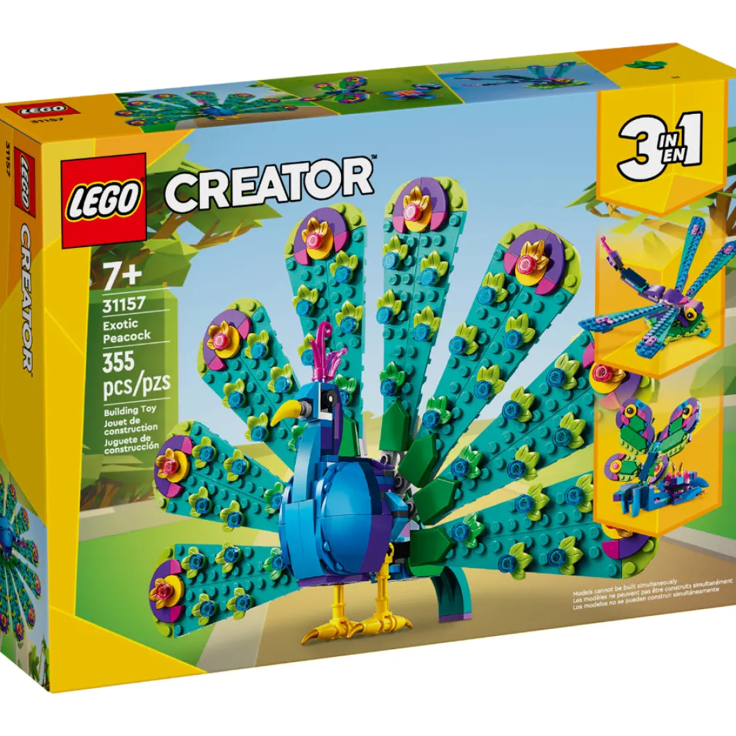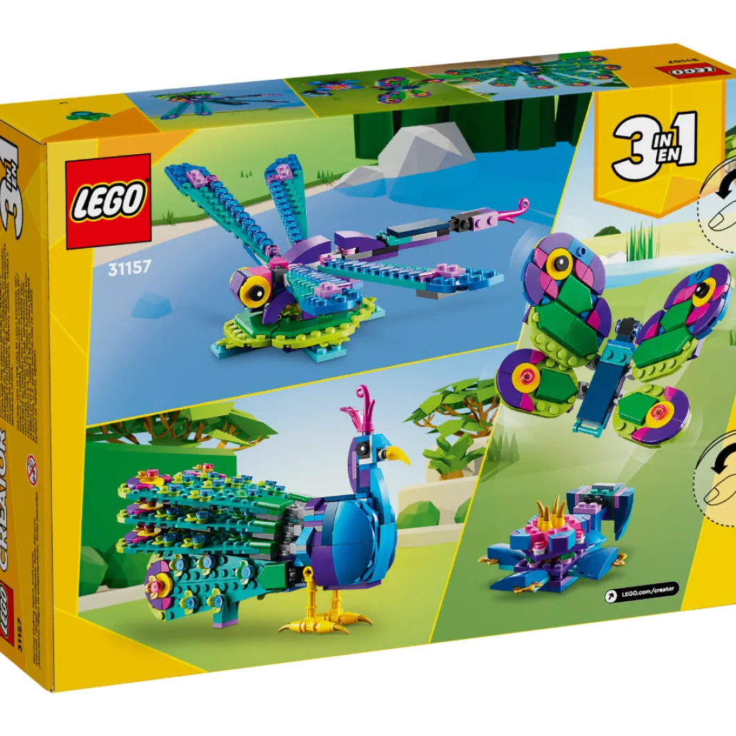 Con el set de construcción Creator 3en1 Pavo Real Exótico (31157), ¡los niños y las niñas de 7 años o más podrán construir 3 juguetes LEGO® de animales exóticos diferentes, jugar con ellos y exponerlos! El pavo real de juguete cuenta con una cola de bellas y detalladas plumas que puede mantener cerrada o desplegar con orgullo. Este set LEGO Creator 3en1 proporciona 3 experiencias de construcción y juego con los mismos ladrillos. Los niños pueden construir una figura de juguete de un pavo real, convertirla en una libélula con alas y cola articuladas sobre una base con forma de nenúfar o transformarla en una mariposa con alas articuladas. Después de jugar, cualquiera de los 3 modelos quedará ideal de adorno en un estante o en la mesita de noche. Los juguetes LEGO Creator 3en1 son regalos fantásticos. A los niños les encantará construir, reconstruir y volver a construir los 3 modelos posibles de cada caja, que abarcan desde vehículos y animales increíbles hasta detalladas escenas urbanas.