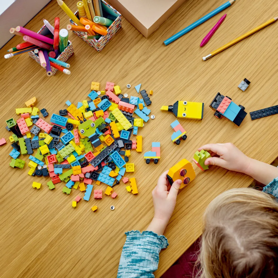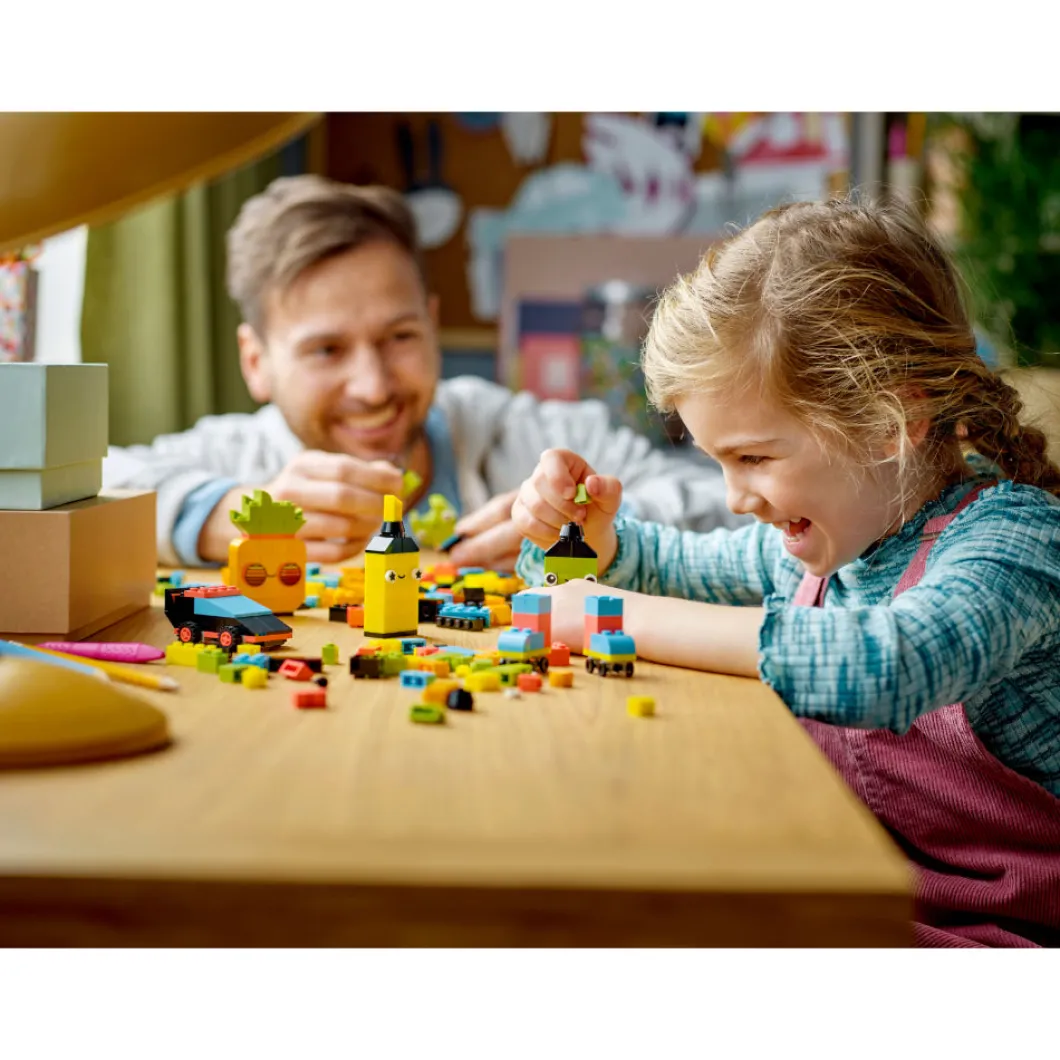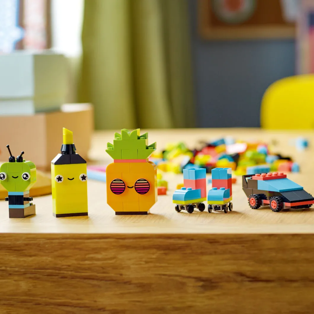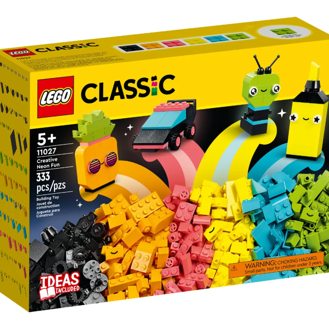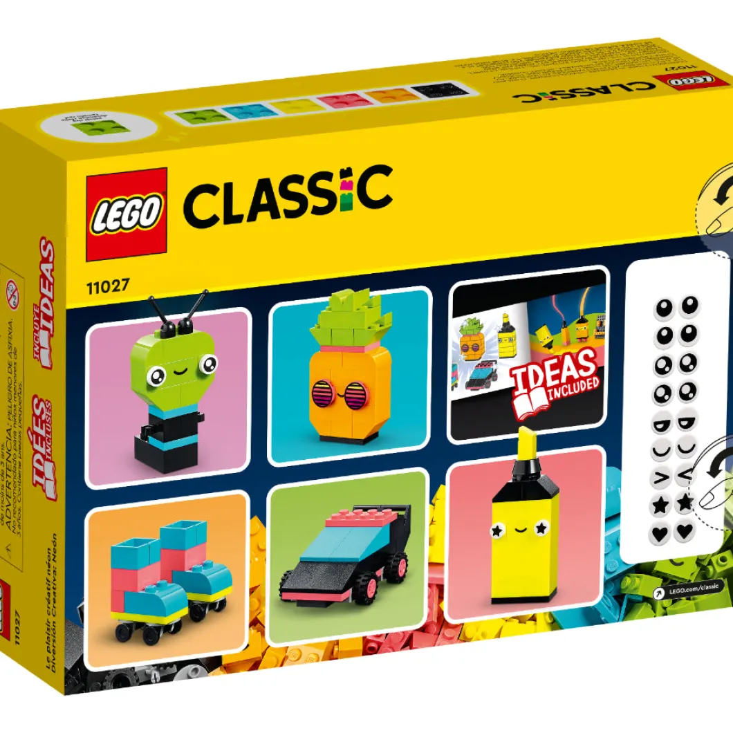 Pon en marcha el desarrollo creativo de tu peque con el llamativo set LEGO® Classic Diversión Creativa: Neón (11027). Incluye sugerencias de modelos rápidos de construir e infinita diversión basada en la construcción libre, y ofrece a los jóvenes constructores a partir de 5 años la oportunidad de disfrutar de su pasión por el arte y el diseño. Ladrillos brillantes para peques creativos Este versátil kit de construcción cuenta con 333 ladrillos de varios tamaños y vivos colores neón. 18 de ellos están decorados con ojos llenos de expresividad que darán vida a las creaciones de los niños y las niñas. Contiene instrucciones impresas para construir 5 divertidos modelos (una piña, un subrayador, un coche, un extraterrestre y unos patines) que permitirán a los peques adquirir confianza suficiente en su creatividad como para atreverse a construir todo lo que puedan imaginar. Las instrucciones de construcción del set también están disponibles en versión digital en la app LEGO Builder.