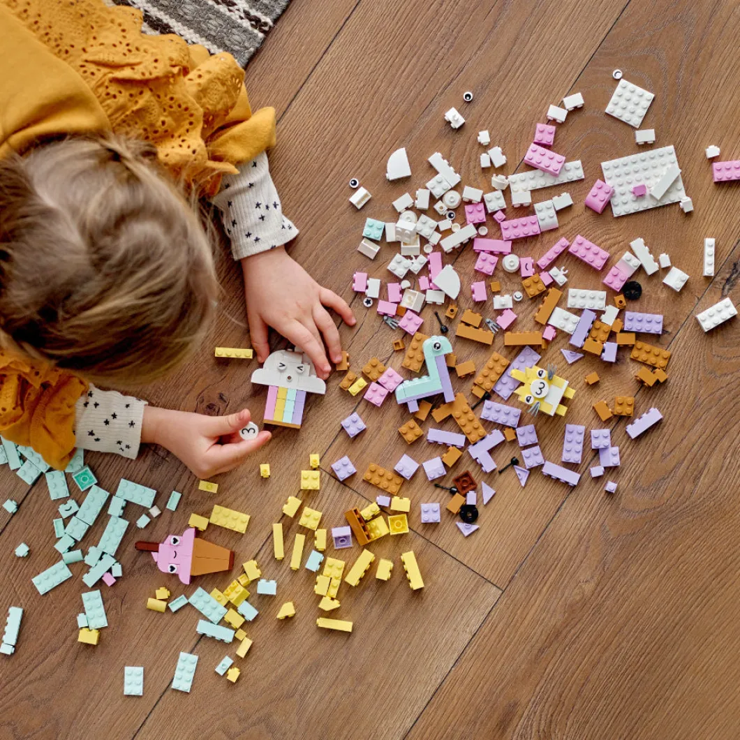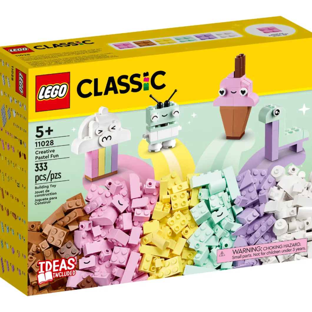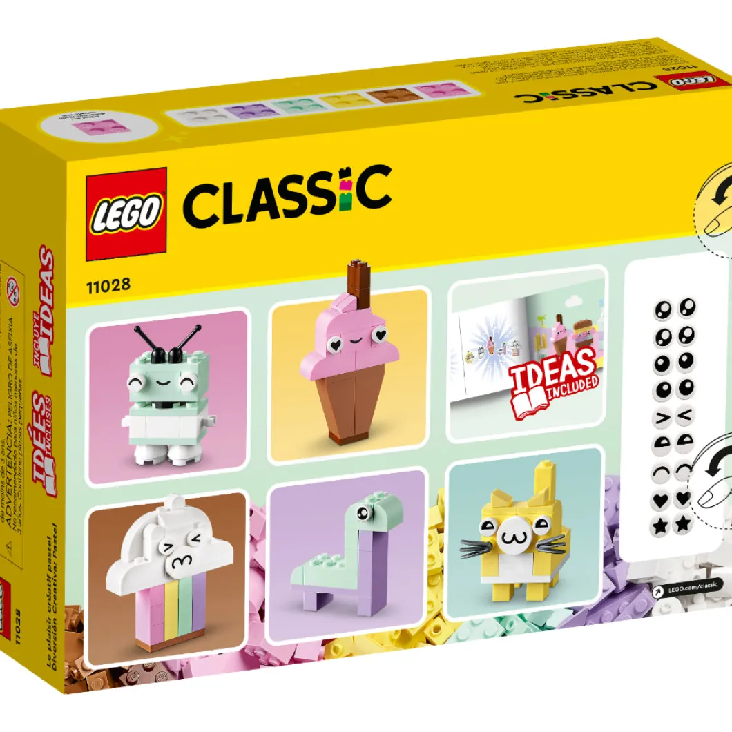 Inspira a tu pequeño constructor o constructora de 5 años o más con el set LEGO® Classic Diversión Creativa: Pastel (11028) y su selección de modelos rápidos de construir. Esta llamativa mezcla de ladrillos, abierta también a la construcción libre, anima a los niños y las niñas a disfrutar de su pasión por el arte y el diseño. Juego creativo en tonos pastel Este creativo kit de construcción contiene 333 ladrillos en una gama de formas, tamaños y colores pastel. 18 de ellos están decorados con ojos llenos de expresividad que los peques pueden usar para dar vida a sus creaciones. Incluye claras instrucciones de construcción en formato impreso para hacer fácilmente 5 modelos: una nube, un helado, un dinosaurio, un gato y un robot. A medida que adquieran confianza en su capacidad creativa, los niños se lo pasarán genial explorando qué más pueden construir. Las instrucciones del set también están disponibles en versión digital en la app LEGO Builder.