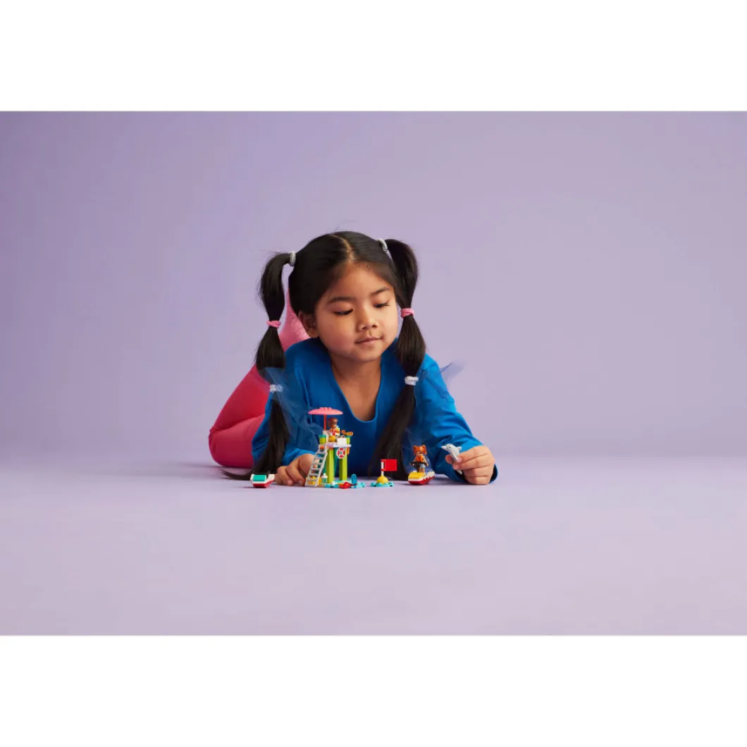 Tu peque creará todo un océano de aventuras con el juguete LEGO® Friends Moto Acuática de la Playa (42623) para niñas y niños de 5 años o más, que incluye 2 minipersonajes, una figura de un delfín y accesorios para fomentar el juego imaginativo. Este set LEGO de socorrismo cuenta con 2 motos acuáticas de juguete que los pequeños utilizarán para interpretar la historia. Leo está de guardia en su torre de socorrista y usa los prismáticos para estar atento a cualquier cosa que suceda en el océano. También es el mirador perfecto para avistar delfines. Más tarde, su amiga Candi y él echan carreras en sus motos acuáticas. A los niños les encantarán los pequeños detalles, ¡como el cangrejo que roba polos de la nevera! Descubre más ideas para regalar en el universo LEGO Friends (sets a la venta por separado), con montones de oportunidades de representar aventuras basadas en la vida real. El set viene con la app LEGO Builder para disfrutar de una sencilla e intuitiva experiencia de construcción. Set de construcción de juguetes con 2 minipersonajes y un delfín: Fomenta el juego imaginativo con el juguete infantil LEGO® Friends Moto Acuática de la Playa, que viene con accesorios para jugar a interpretar historias