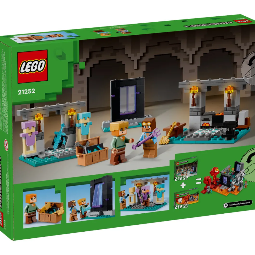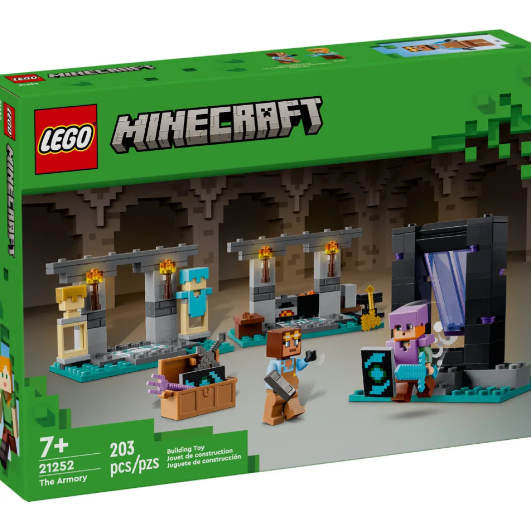 A los jugadores de Minecraft® de 7 años o más les encantará jugar en el mundo real con los elementos y las armas Minecraft del set La Armería (21252). Este kit de construcción LEGO® Minecraft, una fantástica idea de regalo para niños y niñas, les ofrece la puerta de entrada perfecta a las aventuras Minecraft. Este juguete infantil construible incluye 2 conocidas figuras: la heroína de acción Minecraft Alex, con su escudo y su espada de diamante, y el armero. Puedes explorar 3 entornos: la zona de trabajo, con un yunque, un horno, una piedra de afilar y un caldero lleno de lava; la sala de exposición de armaduras, cuyo cofre contiene un hacha dorada, un tridente encantado, una espada de netherita, un casco y otros recursos Minecraft; y el portal del Nether, con su entrada de puertas batientes hacia la nueva aventura de los jugadores. El juguete Minecraft puede combinarse con otros sets LEGO Minecraft, como La Emboscada en el Portal del Nether (21255), a la venta por separado.