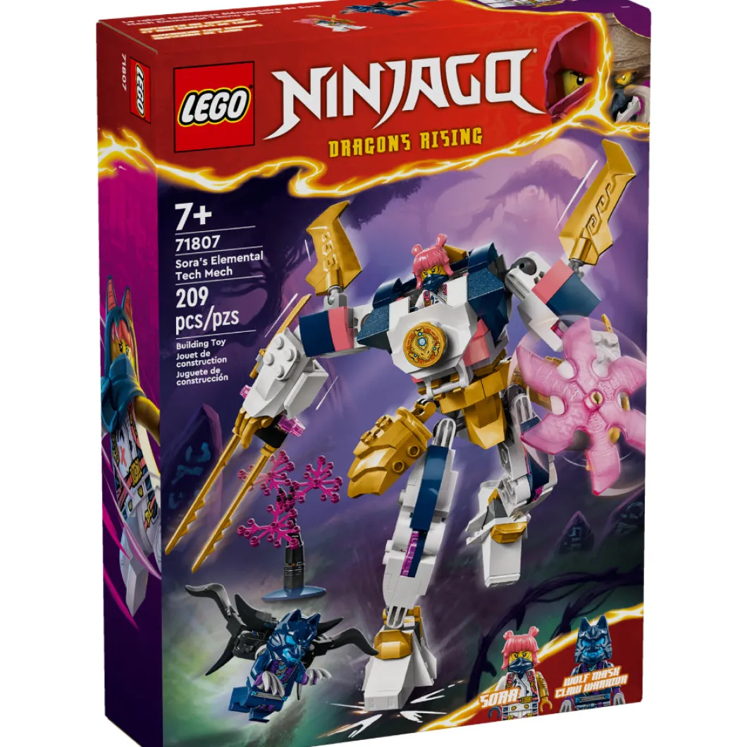 Los niños y las niñas de 7 años o más podrán recrear las historias de la temporada 2 de la serie para televisión NINJAGO®: El Renacer de los Dragones con el juguete de aventuras Meca Elemental Tecno de Sora (71807). El impresionante meca cuenta con brazos y piernas articulados que los niños pueden inclinar y girar para colocarlo en dinámicas posturas de combate, así como con una gran espada, una cuchilla giratoria y una cabina para la minifigura de la ninja. ¡Este meca inédito personalizable también permite a los peques construir su propio meca! Sus piernas, brazos y torso desmontables se intercambian con los de otros 2 mecas: el Meca Elemental de la Tierra de Cole (71806) y el Meca Elemental del Fuego de Kai (71808), a la venta por separado. Los niños se lo pasarán genial combinando las distintas partes para crear una figura de acción de juguete totalmente única. El juguete ninja viene con 2 minifiguras: Sora, con 2 catanas, y un guerrero con garras Máscara de Lobo.