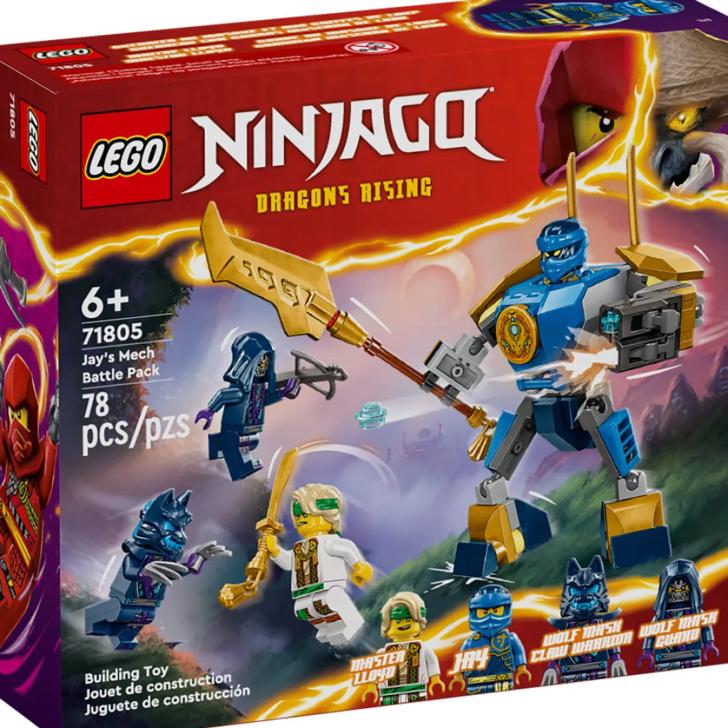 Los niños y las niñas de 6 años o más podrán interpretar las trepidantes escenas de batalla de la temporada 2 de la serie para televisión NINJAGO®: El Renacer de los Dragones con el juguete de aventuras Pack de Combate: Meca de Jay (71805). Este juguete de construcción para jóvenes ninja incluye una figura alucinante de un meca con brazos, piernas y torso articulados que empuña una gran espada dorada y dispara proyectiles con sus 2 cañones. Este juguete ninja contiene 4 minifiguras NINJAGO y montones de accesorios. Jay está armado con una espada dorada y la minifigura del Maestro Lloyd cuenta con 2 catanas doradas. El guerrero con garras Máscara de Lobo tiene garras en todos los dedos de las manos y el guardián Máscara de Lobo lleva una ballesta. Dentro de la gama LEGO® NINJAGO de juguetes ninja construibles, los fans también encontrarán dragones, vehículos y templos para interpretar historias con sus héroes. Además, la app LEGO Builder, les guía en la aventura de construcción.