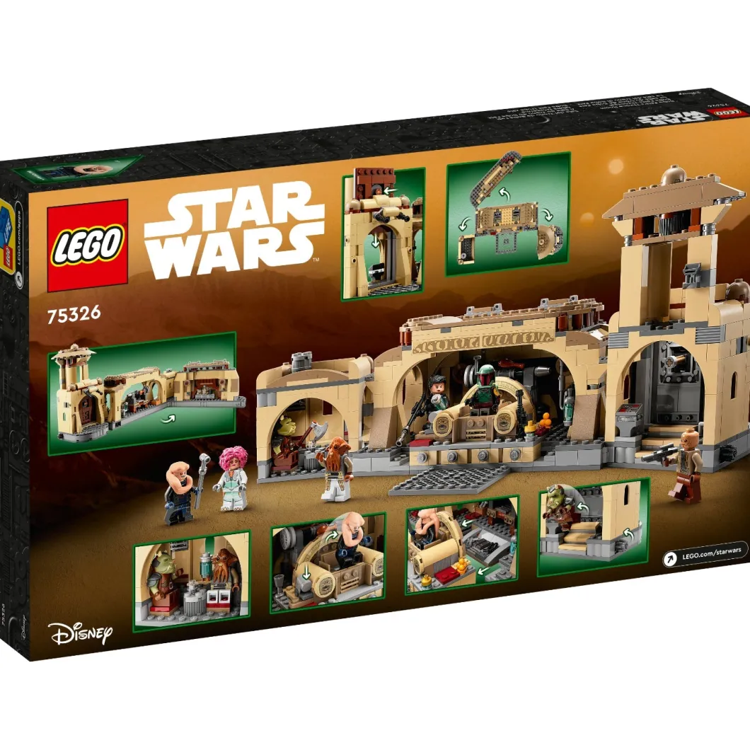 Escribe nuevos capítulos de la saga Star Wars: El Libro de Boba Fett con el juego construible Sala del Trono de Boba Fett (75326) para fans a partir de 9 años. La maqueta del palacio para construir se abre y facilita el acceso a la detallada sala del trono, la zona de barbacoa y la cocina. Hay un trono con un compartimento oculto que contiene un tesoro y una función de eyección que expulsa a Bib Fortuna, así como escalones que se inclinan, una puerta que se abre y montones de divertidos accesorios.
