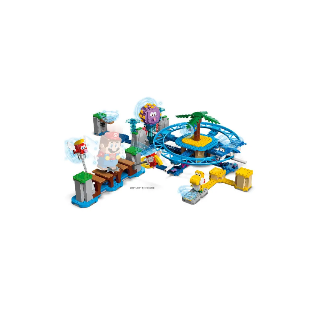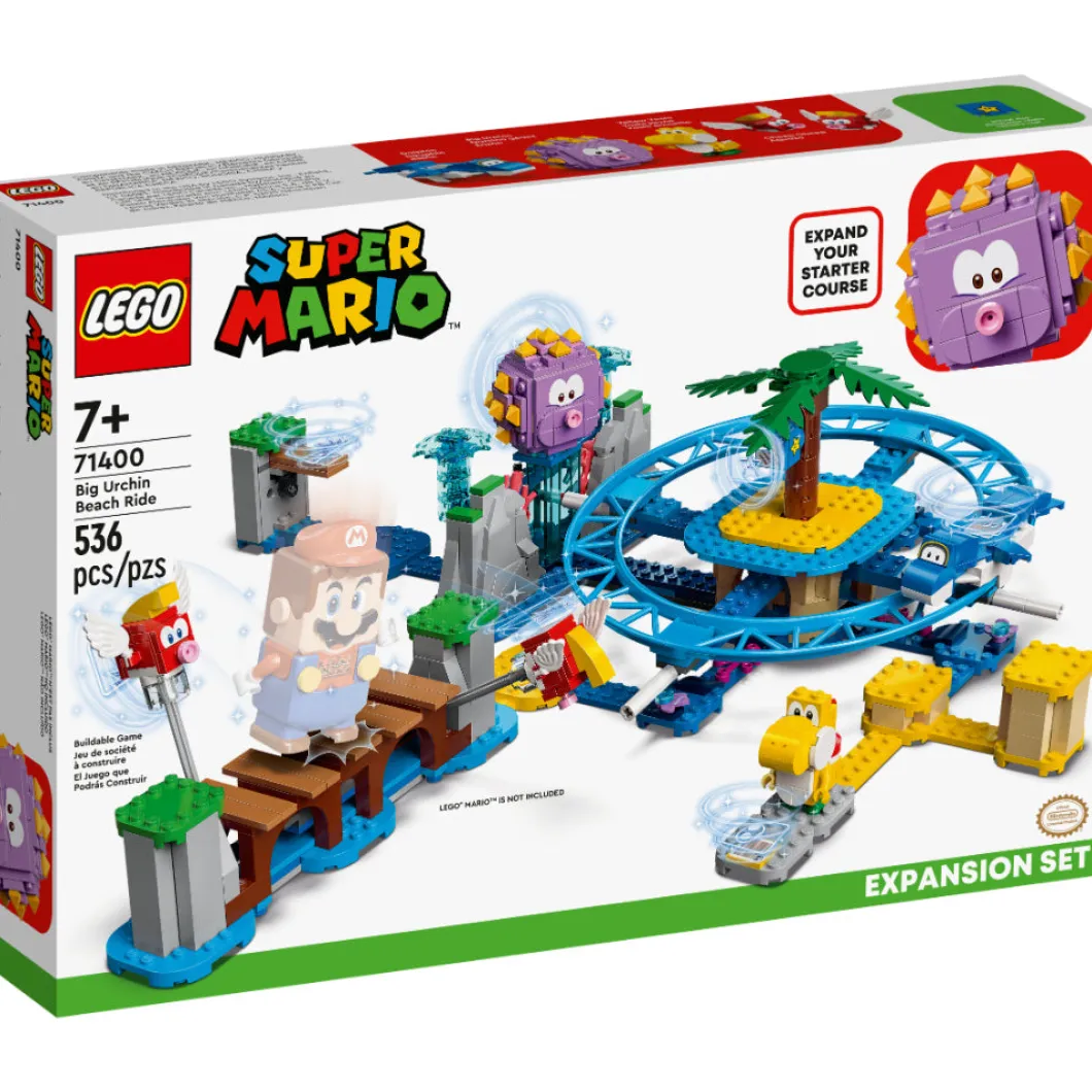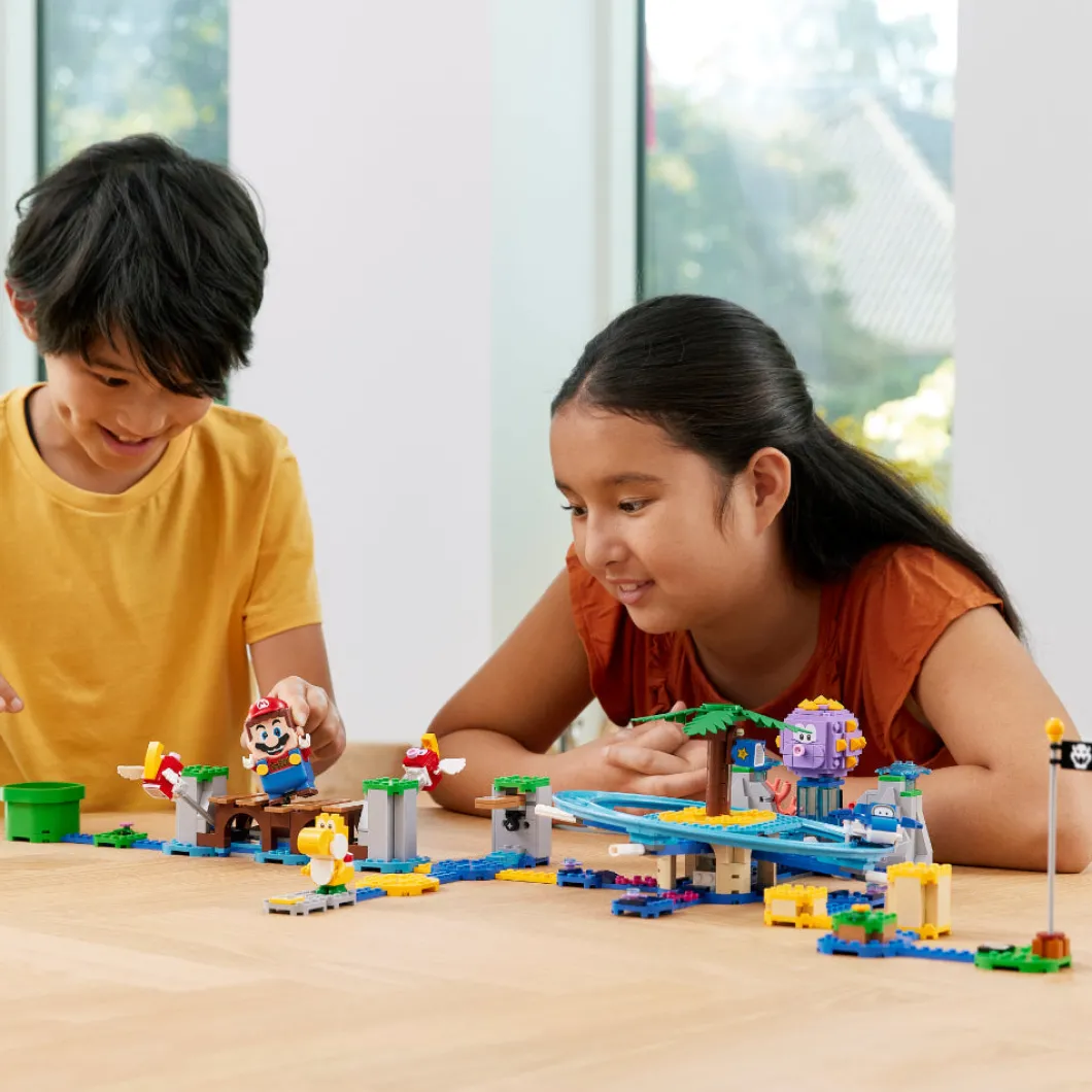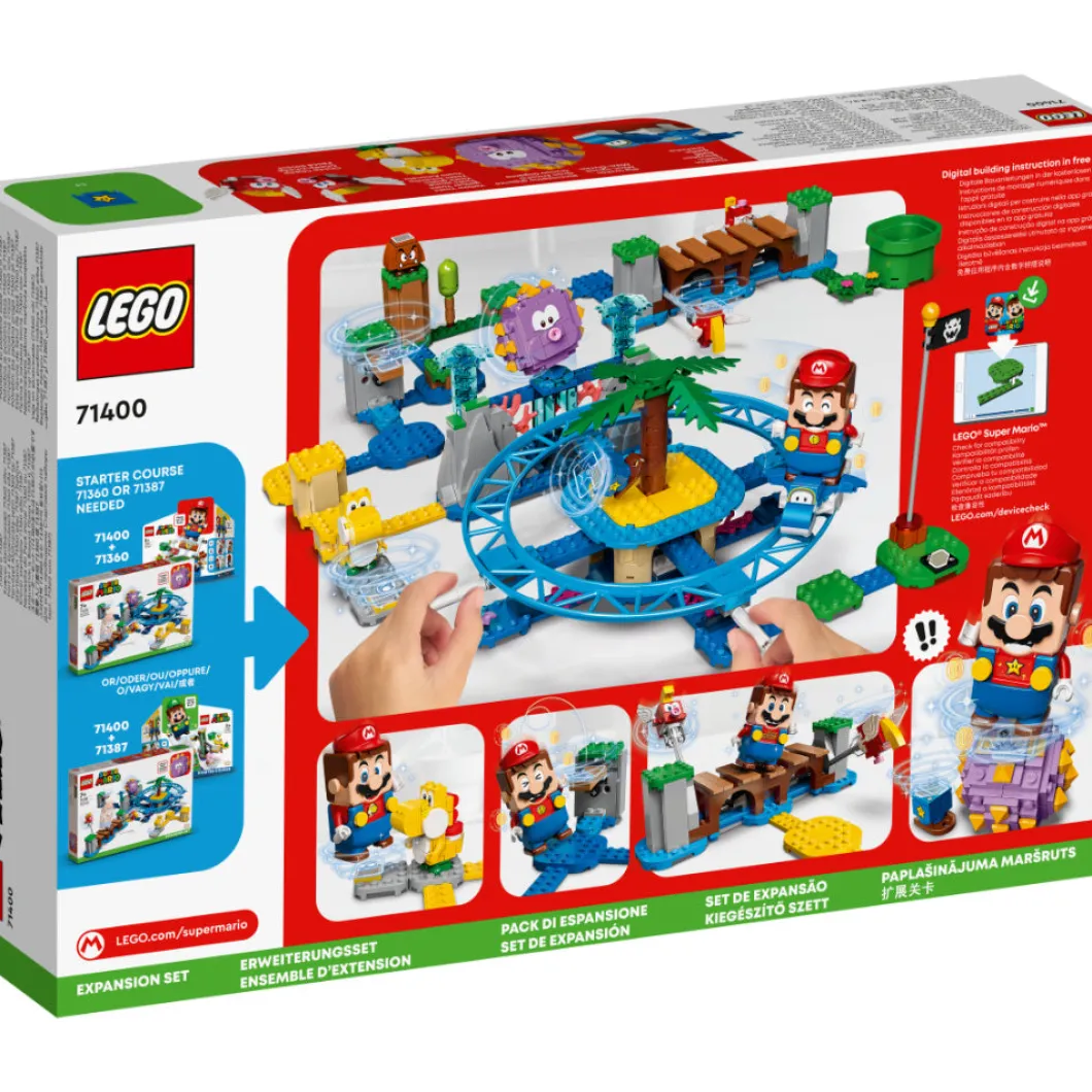 Crea un trepidante nivel con el Set de Expansión: Desafío en las olas contra el Gran Erincho LEGO® Super Mario™ (71400) para mayores de 7 años. Contiene una montaña rusa con una figura LEGO de un Delfín que llevará a lomos a LEGO® Mario™ o LEGO® Luigi™ (figuras no incluidas) mientras sacuden una palmera para tratar de hacer caer el bloque de la superestrella y derribar al Gran Erincho. Da brincos en el puente para que salten los Cheep Cheeps y recoge más monedas digitales por tus espectaculares giros desde el trampolín y por tus divertidas interacciones con la figura de juguete de Yoshi Amarillo. (Nota: Para jugar de manera interactiva, necesitas el pack inicial 71360 o 71387).