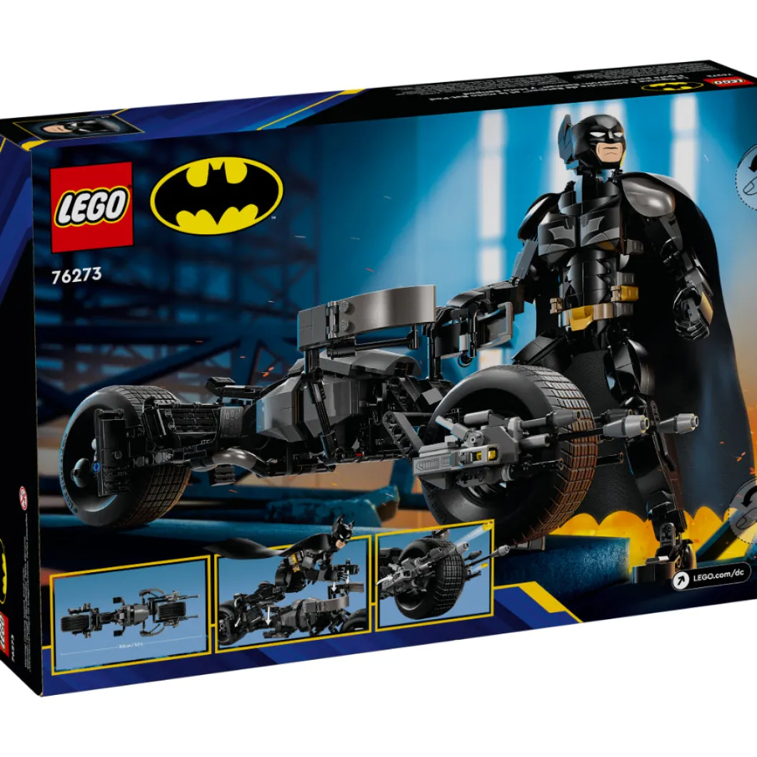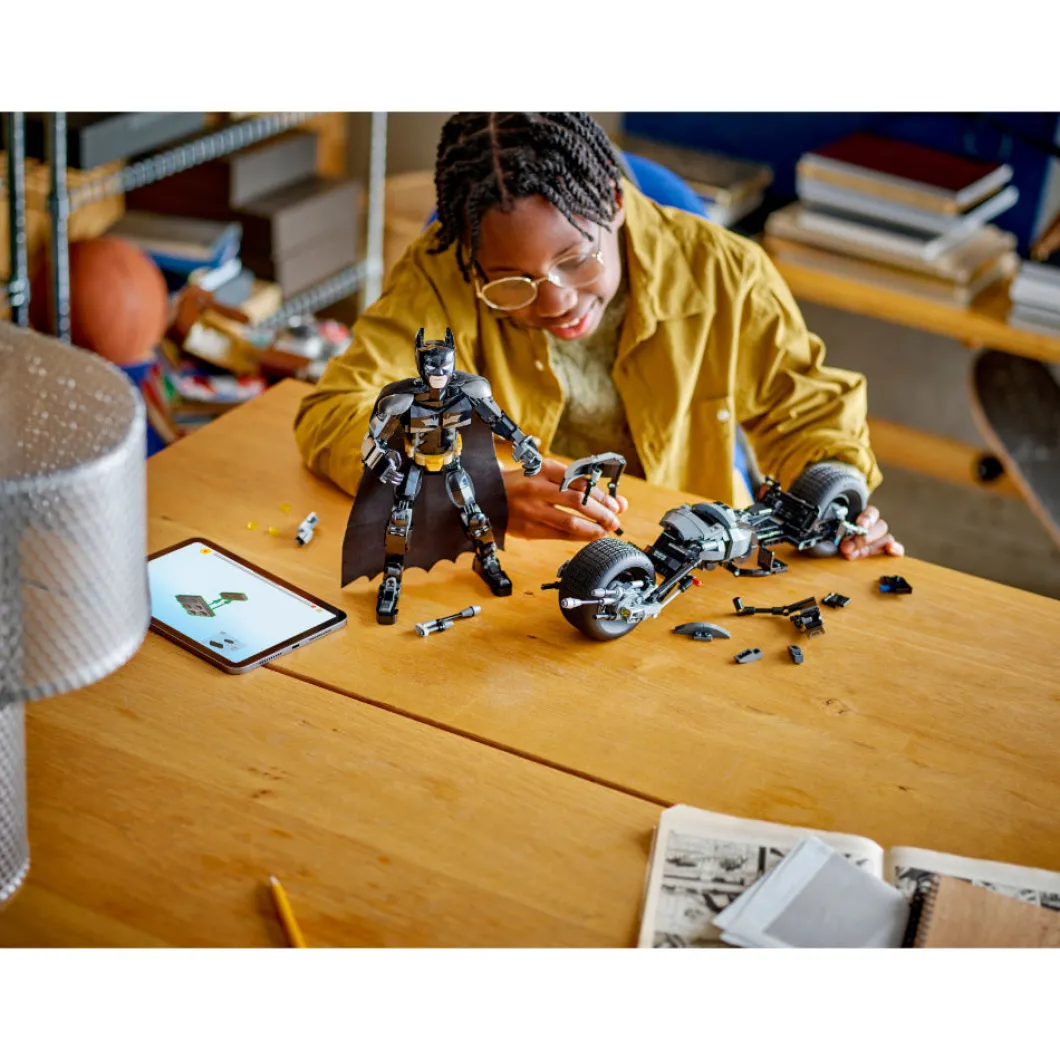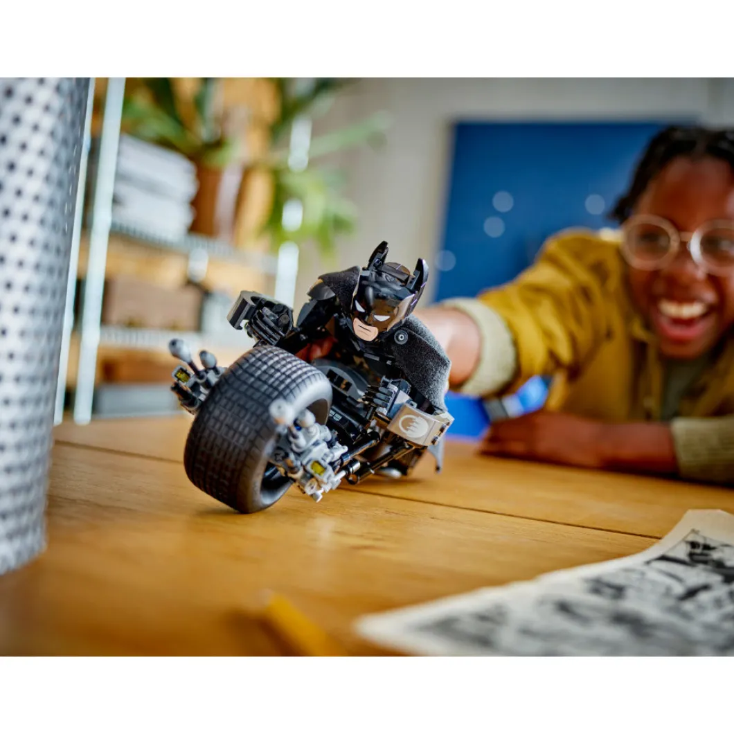 El set LEGO® DC Batman™ Figura para Construir: Batman y Moto Bat-Pod (76273), basado en la película El caballero oscuro, reúne los componentes ideales para cualquier fan del emblemático superhéroe a partir de 12 años. Totalmente articulado y con una altura aproximada de 26 cm, este juguete con detalles de gran fidelidad es tan fantástico como deseable para tu colección. Las articulaciones móviles del juguete en hombros, brazos, caderas y piernas permiten a los peques colocarlo en posturas geniales y crear aventuras dinámicas, ¡por eso esta figura del superhéroe es perfecta para construir, jugar y exponer! La detallada figura de acción de Batman viene con su moto Bat-Pod ultramoderna, equipada con 2 lanzadores. Para disfrutar también de la diversión digital, los constructores y las constructoras pueden acercarse y girar versiones 3D de sus sets y seguir sus progresos en la intuitiva app LEGO Builder.