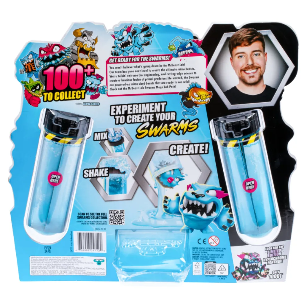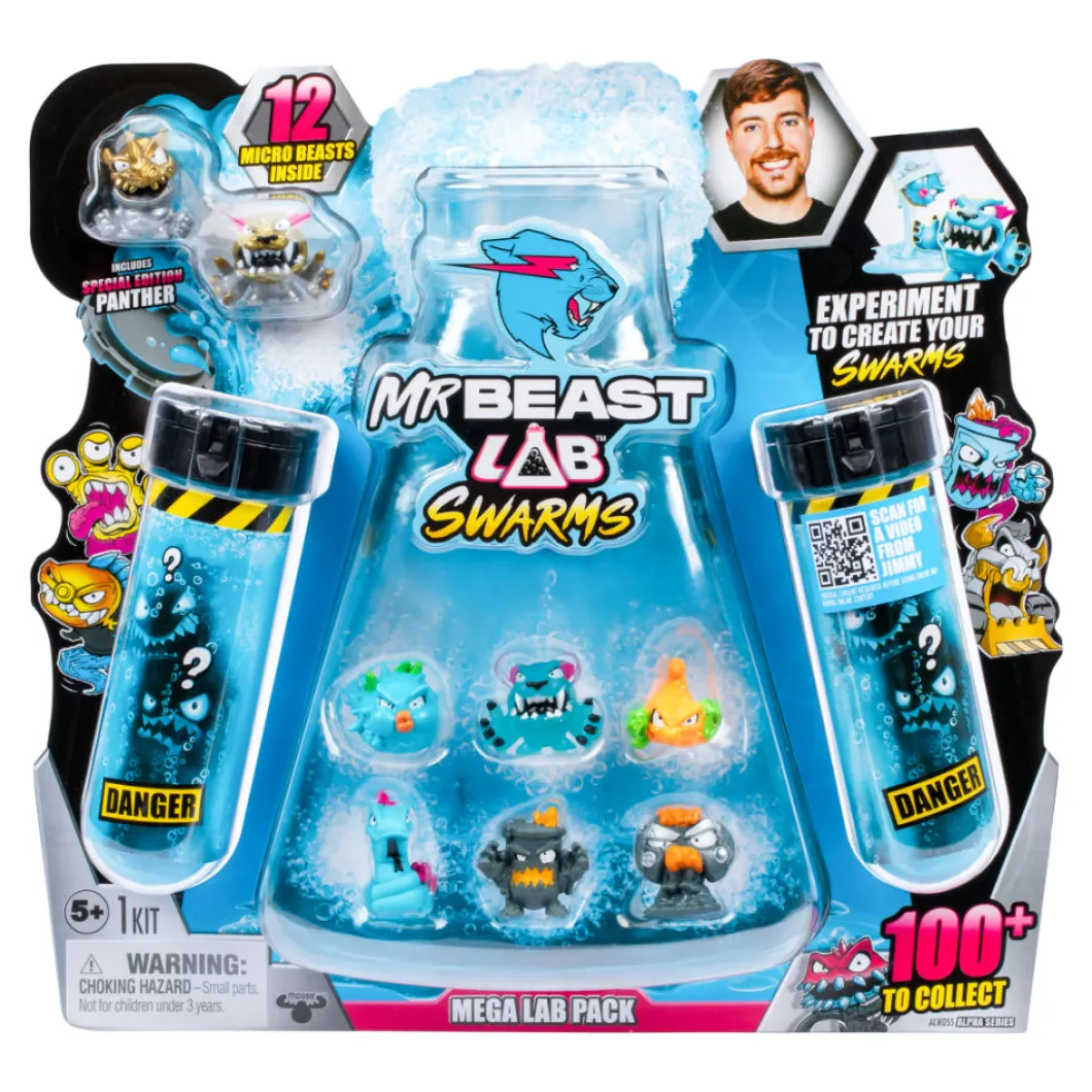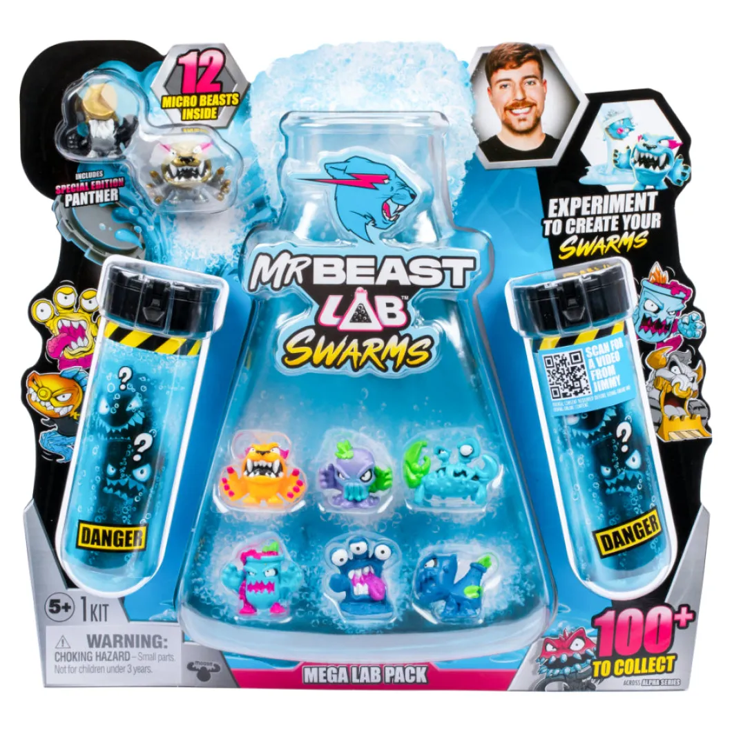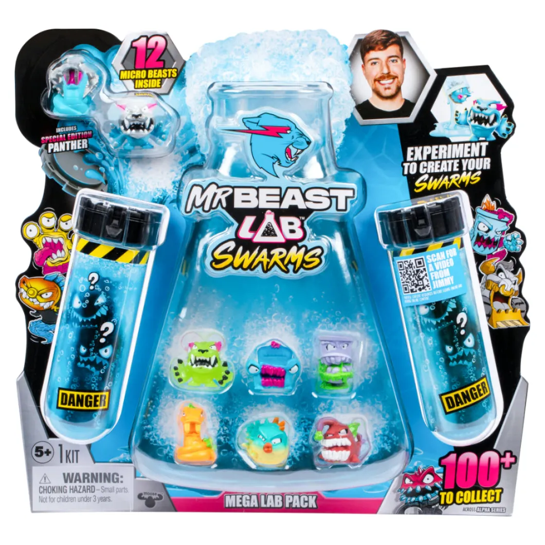 ¡Desata tu lado científico con MrBeast Lab Swarms! Cada mega paquete es una sorpresa llena de diversión. ¡Descubre 12 minifiguras únicas y aleatorias en cada uno! Mezcla, agita y crea tus propias criaturas microscópicas. Con más de 100 micro bestias para coleccionar, ¡nunca sabrás cuál será tu próxima aventura! ¡Incluye una edición especial de la pantera para completar tu colección!
