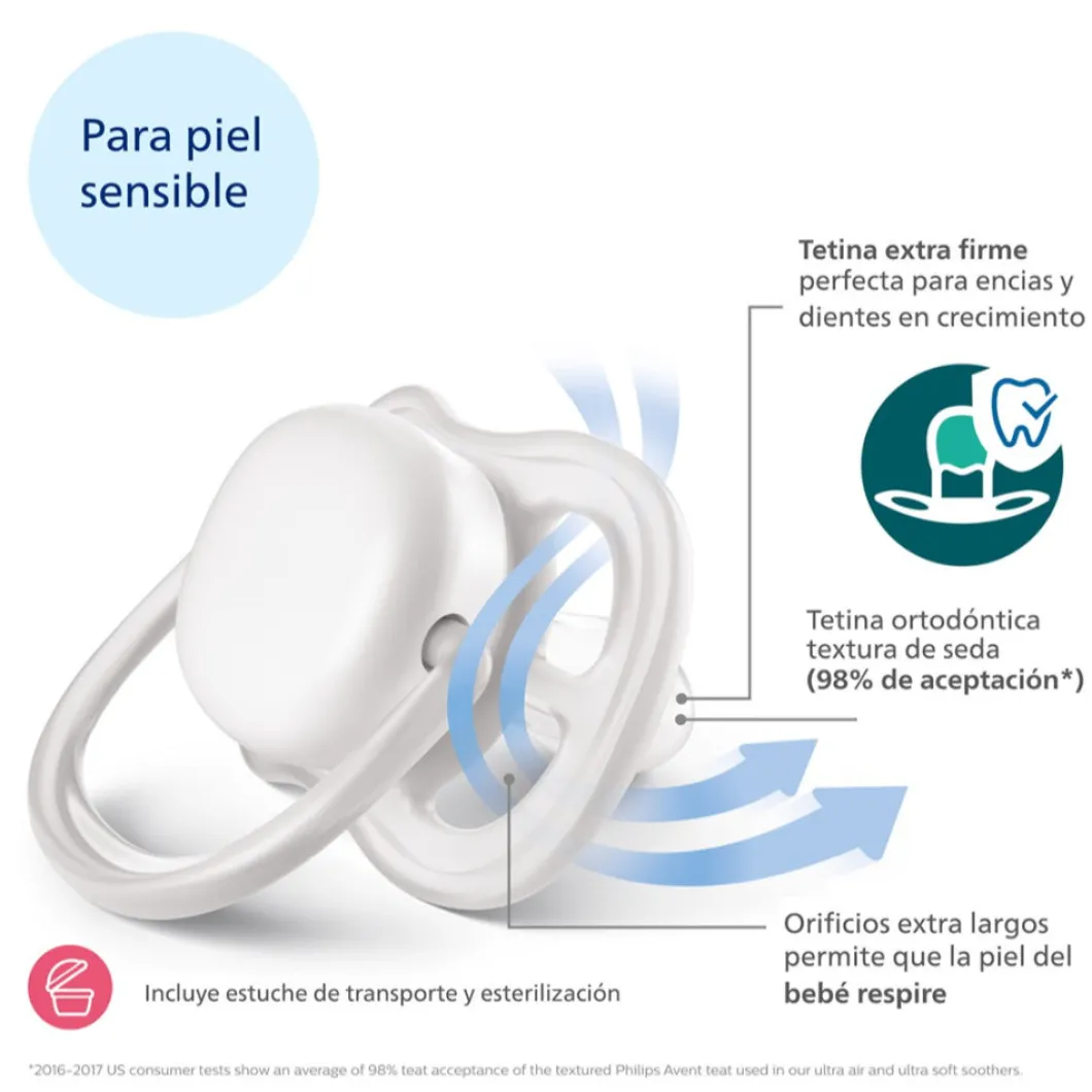 El chupete ultra air está diseñado para que se sienta ligero y cómodo, incluida su tetina sedosa.