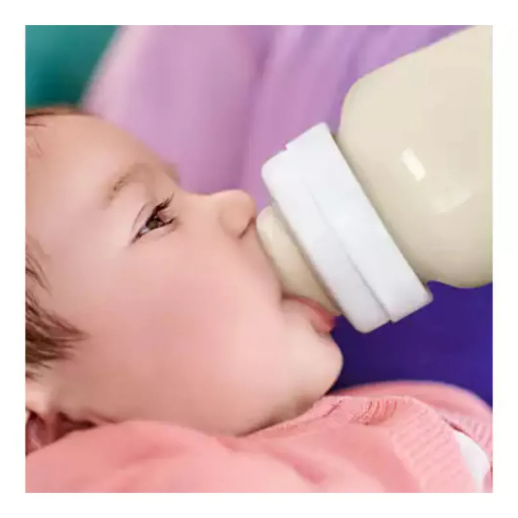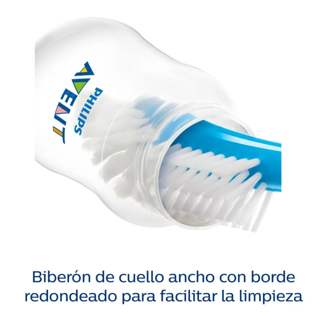 Biberón de cuello ancho con borde redondeado para facilitar la limpieza