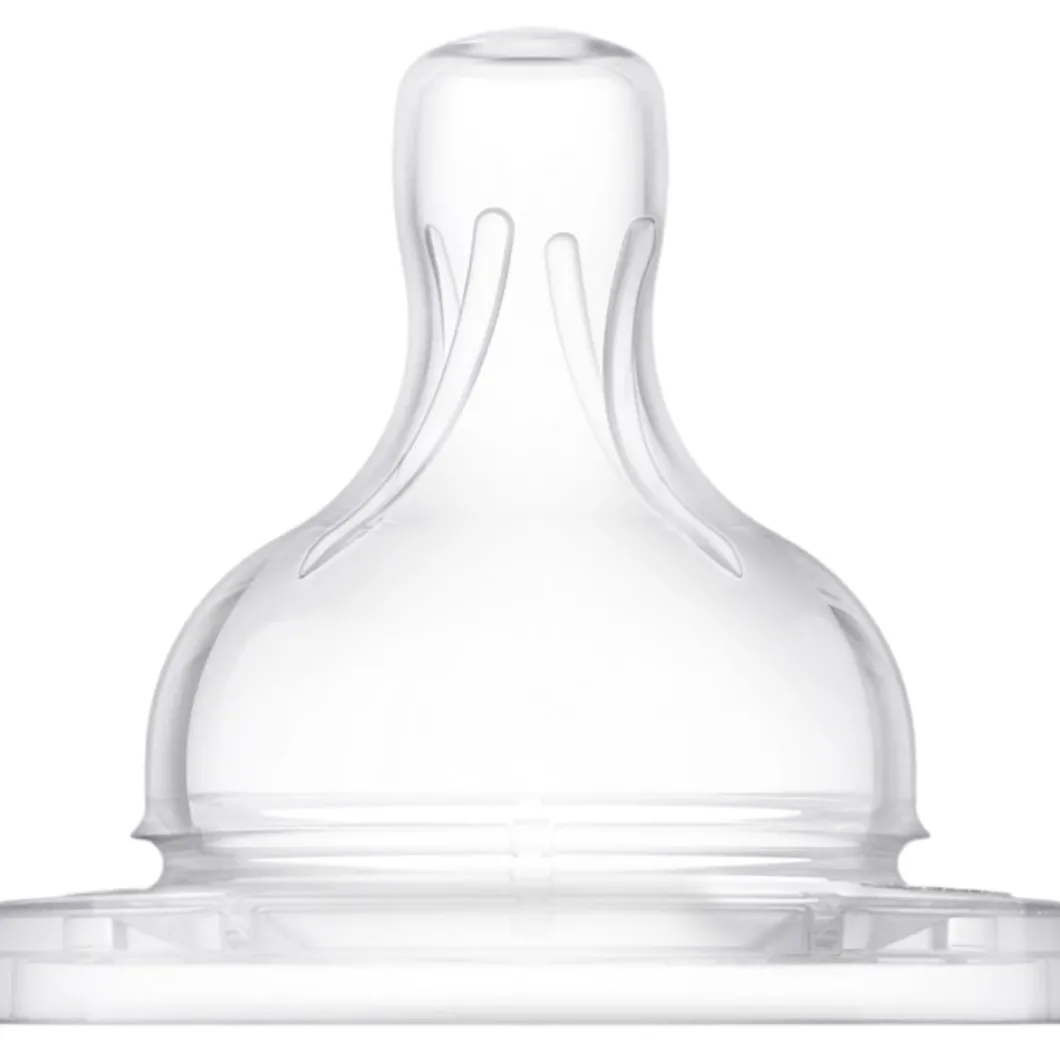 La forma de la tetina permite un agarre seguro y la textura acanalada evita la contracción de esta, lo que brinda una alimentación cómoda e ininterrumpida.