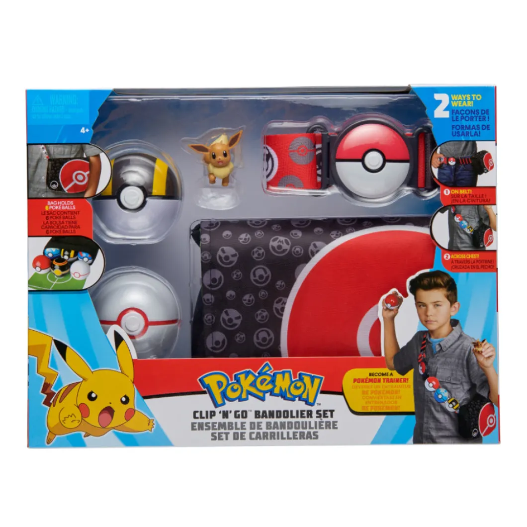 Fácil de llevar en la cintura y sobre el hombro, el juego de cinturones Clip ‘N’ Go Bandolier no solo es una manera fácil de sostener hasta 6 Clip ‘N’ Go Poké Balls, sino que también se abre para revelar un tapete de batalla para todos tus favoritos. ¡Personajes Pokémon de 2 pulgadas para entrenar!