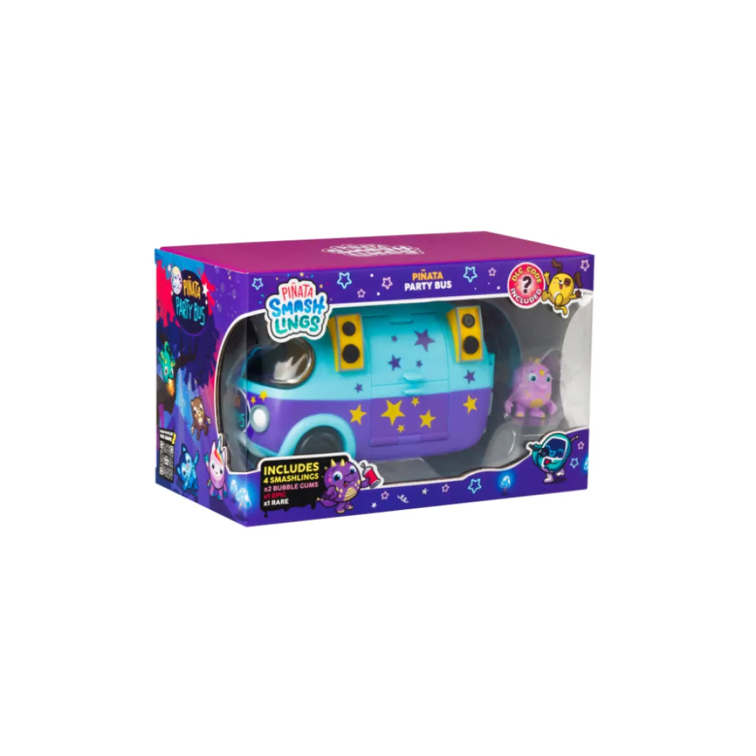¡CELEBRA UNA FIESTA DE PIÑATA EN EL PARTY BUS! Incluye 3 accesorios de juego: 2 parlantes extraíbles y 1 bola de discoteca extraíble, puertas que se abren y ruedas giratorias. Muestra todos tus Smashlings favoritos dentro del Party Bus; las bisagras seguras garantizan que tu colección esté siempre protegida.