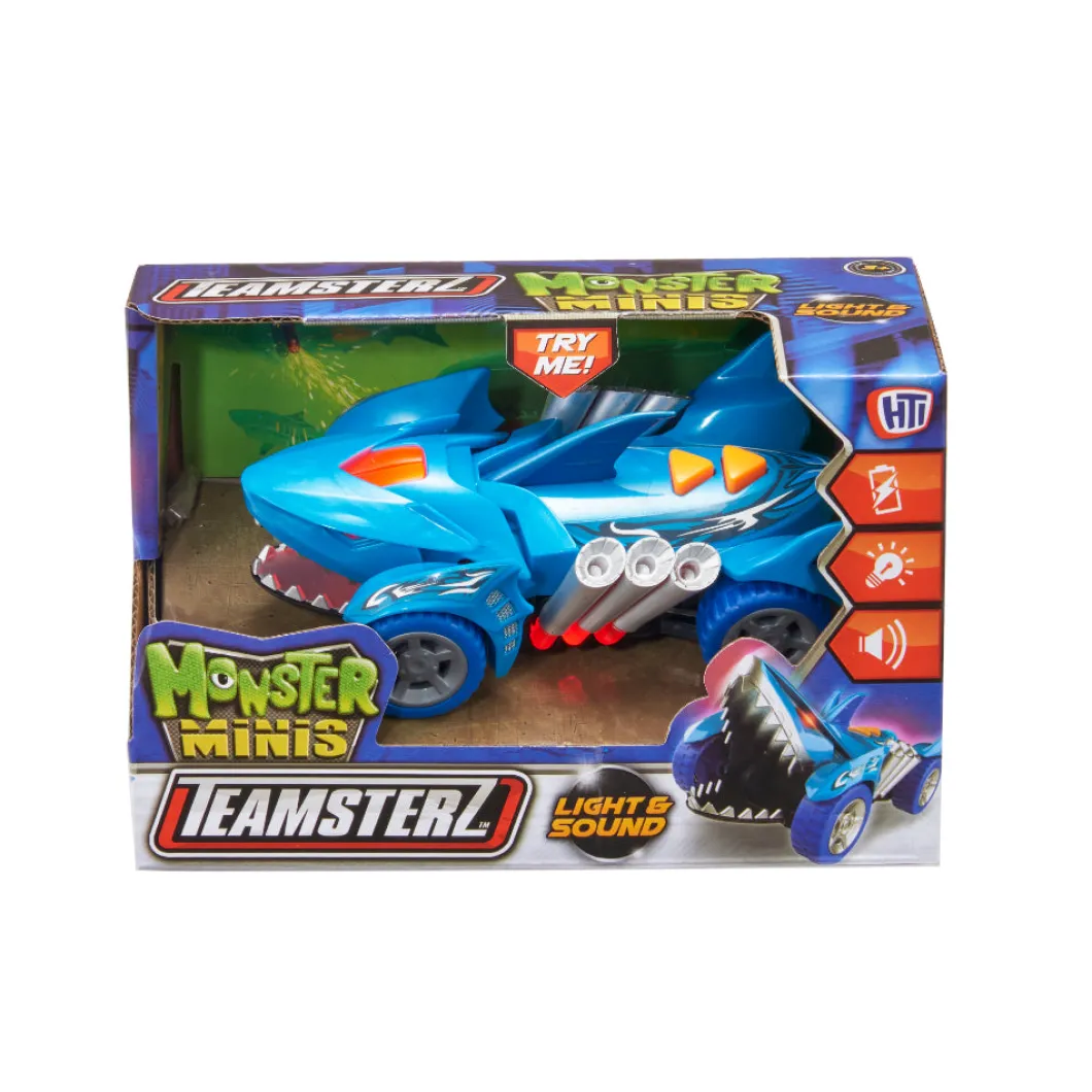 ¡Cuidado con el tiburón! Empuje al feroz tiburón Teamsterz Monster Minis para activar sus mandíbulas, presione los botones para reproducir los sonidos del motor y del monstruo; Además de las luces intermitentes.